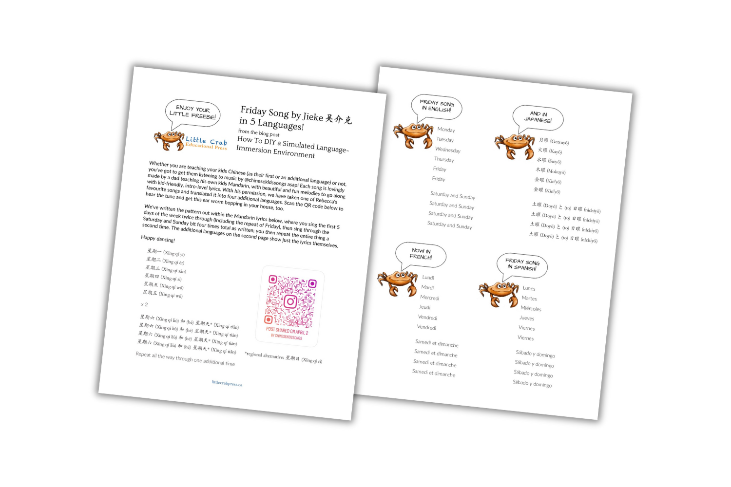 With permission, we took an ear worm written and performed by @chinesekidssongs on Instagram and YouTube and translated it into English, Japanese, French, and Spanish. This song is an absolute bop, and the freebie includes a QR code to take you directly to the Instagram post where you can hear it (and teach it to your kids!).