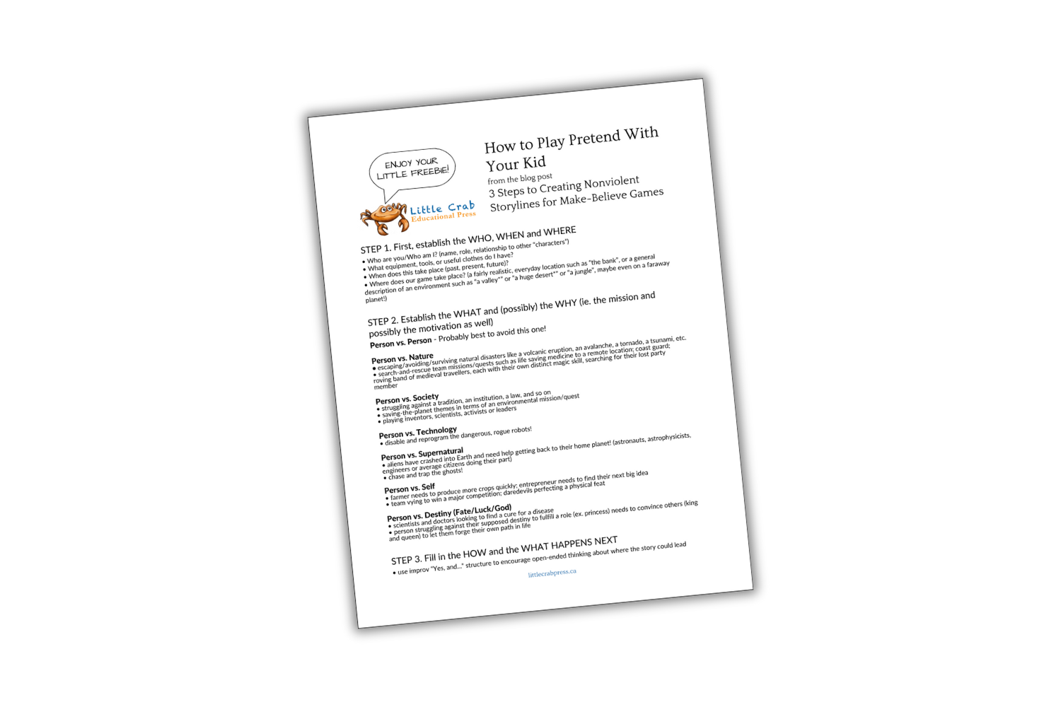 From the blog post “3 Steps to Creating Nonviolent Storylines for Make-Believe Games”, this cheat sheet walks you through Step 1 (establish the Who, When, and Where), Step 2 (establish the What), and Step 3 (fill in the How and What Happens Next).