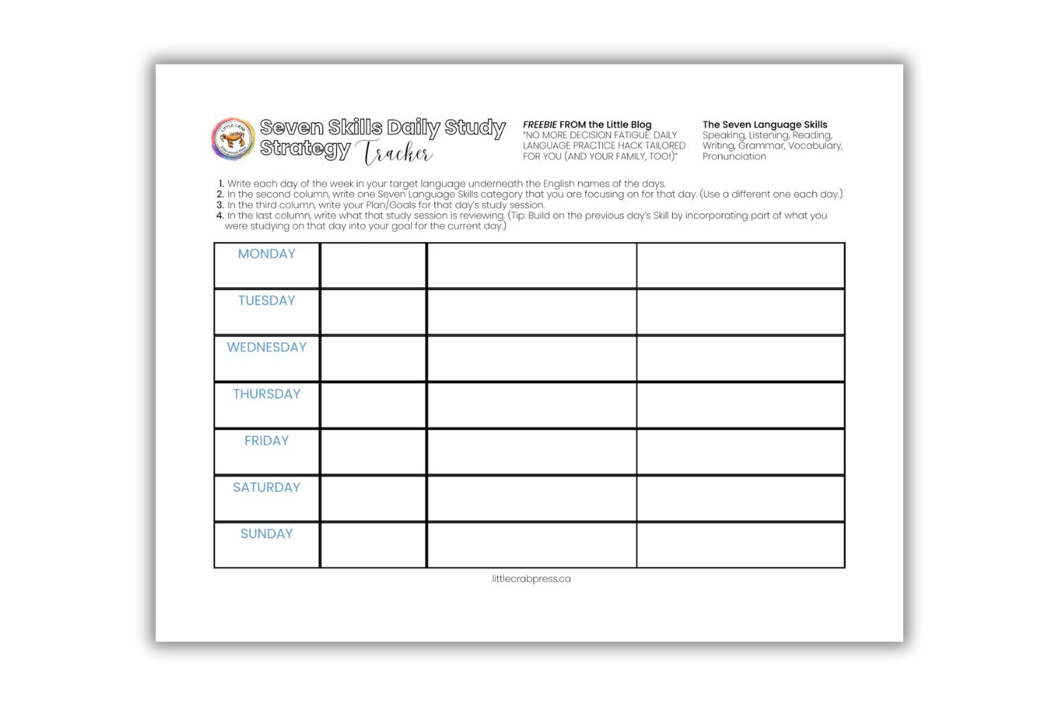 All of our products are built around some or all of the Seven Language Skills (Speaking, Listening, Reading, Writing, Grammar, Vocabulary, Pronunciation), and we built this tracker around the concept of utilizing all of those skills in your language study to create a balanced, well-rounded understand and knowledge of your target language.