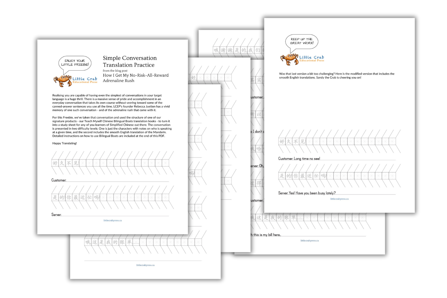 We have pre-filled our proprietary Bilingual Boats sheets with a simple conversation to practice Mandarin translation at two levels: The first with just the characters themselves, the second with smooth English translations. Both let you practice individual character translations, note definitions, any grammar points you need, and Pinyin as required.