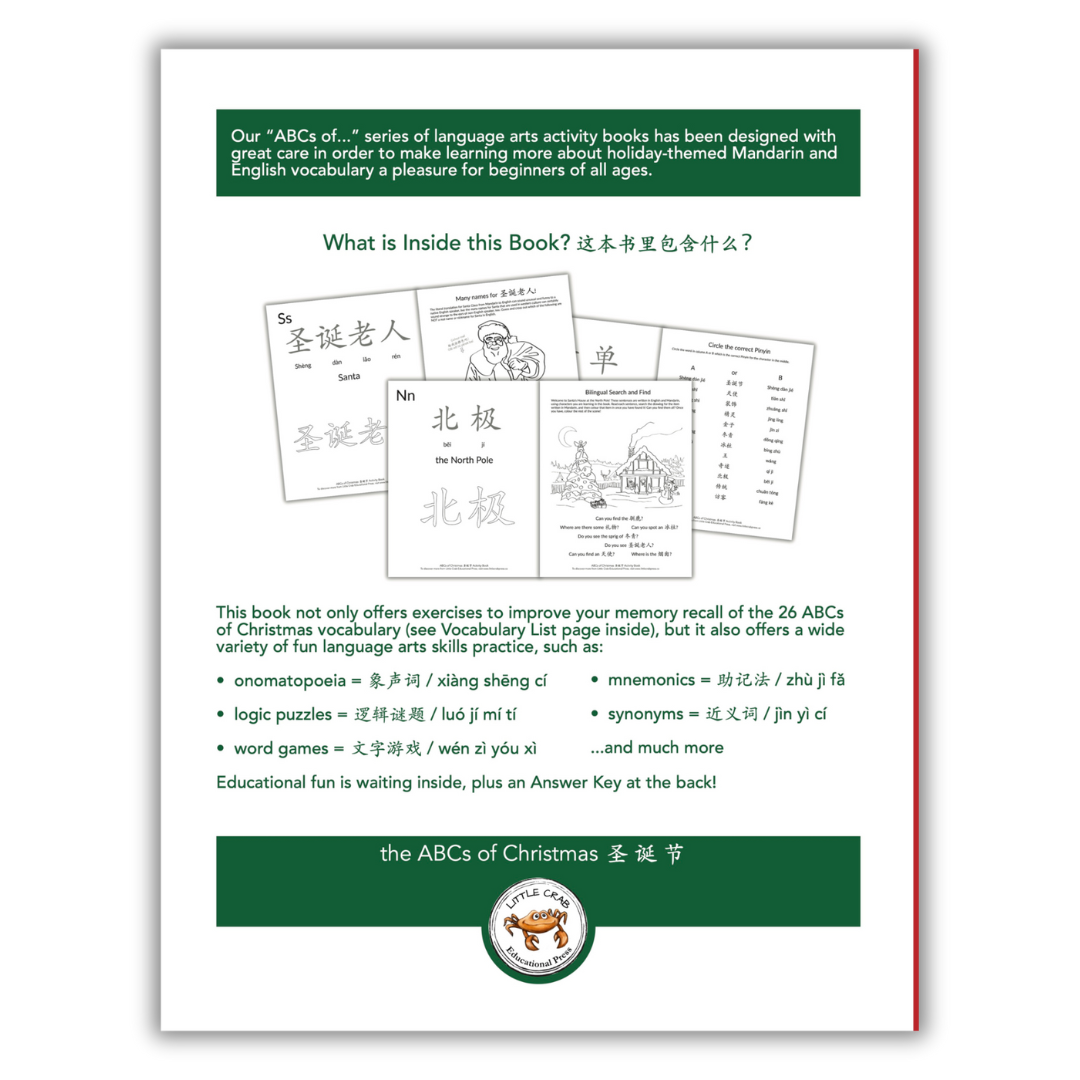 Give your child the gift of bilingualism and a love for learning with this fun and engaging ABCs of Christmas: Dual Language Activity Book. Designed for parents, teachers, and young learners, this book will make learning Christmas vocabulary in Mandarin and English easy and enjoyable.
