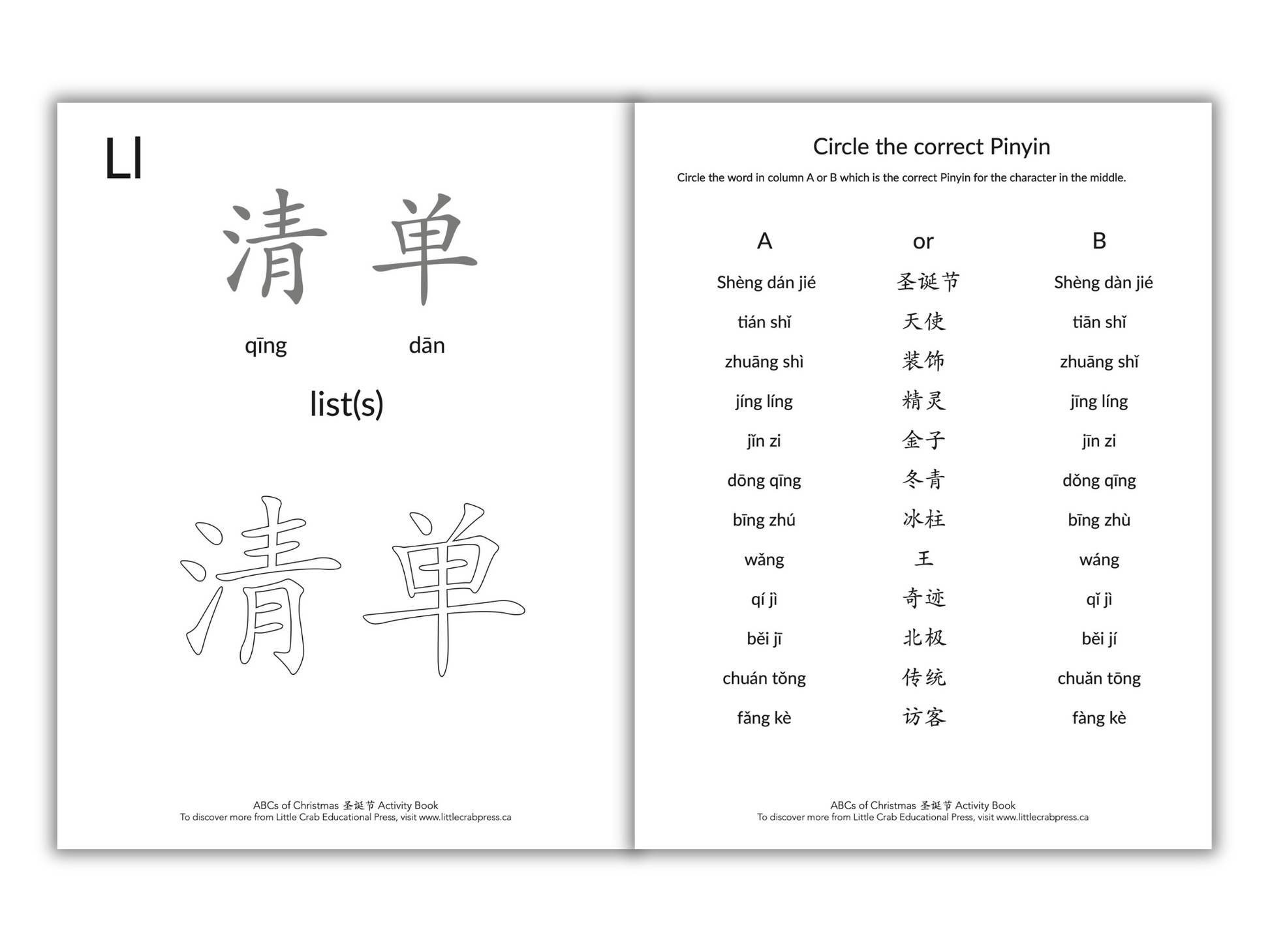 Learn Simplified Chinese characters (简体字 / jiǎntǐzì), English words (英语单词 / Yīngyǔ dāncí), and Pinyin (拼音 / Pīnyīn) to boost your child’s language skills, making it easier for them check the meaning. of 26 A through Z Christmas words in either language.