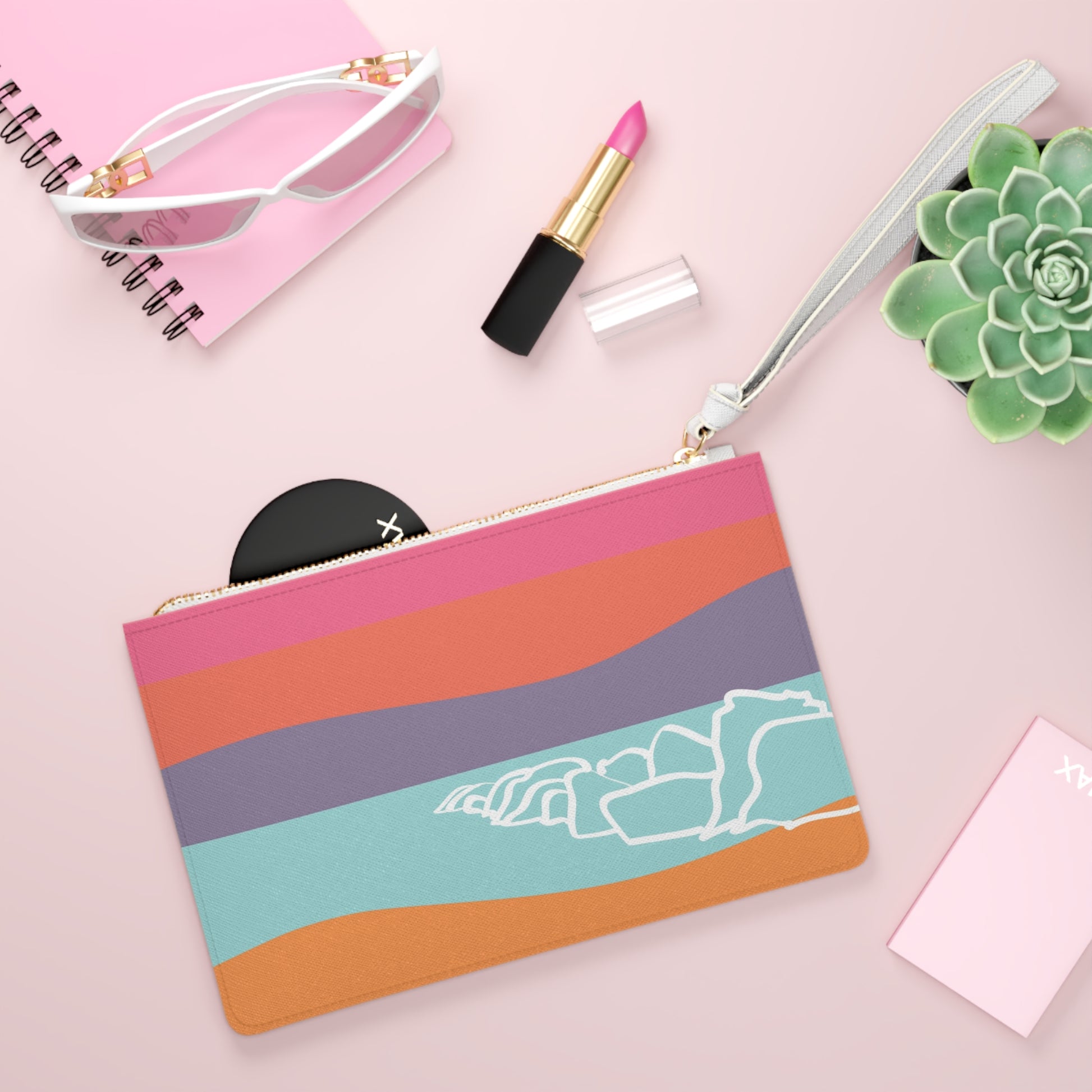 This Beach Motif 感恩 Clutch Bag is a stylish accessory with a hand-drawn colour-blocked image, perfect for those whose Happy Place is filled with beach vibes and gratitude. It is great for summer outings, beach trips, and casual events. Ideal for those who appreciate unique and artistic accessories, it is relevant for vacations, parties, and casual gatherings.