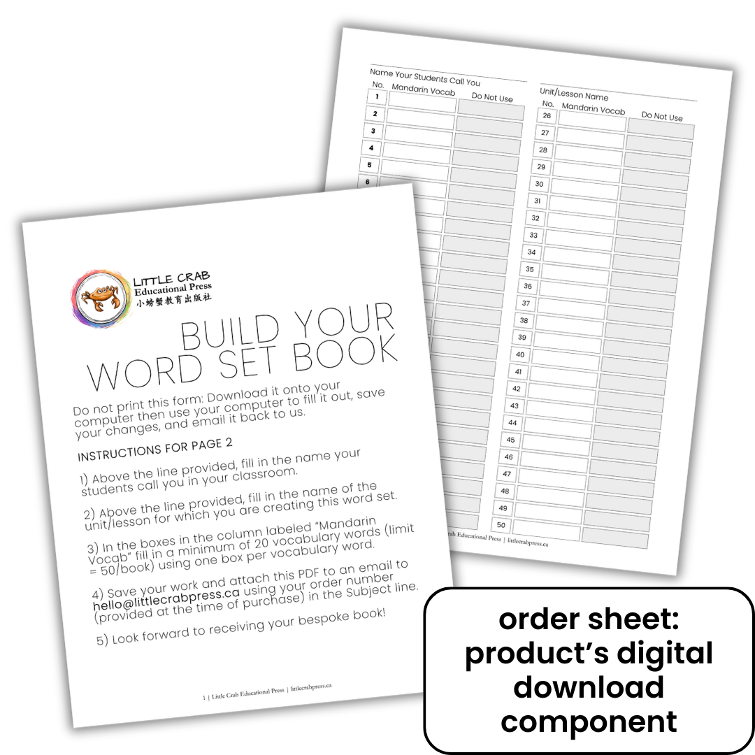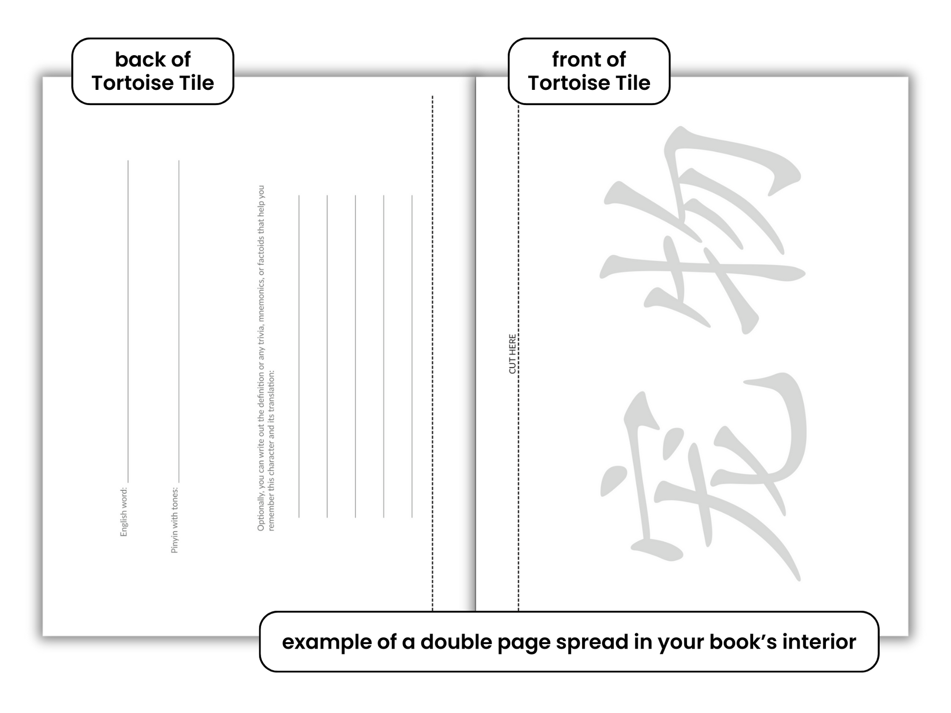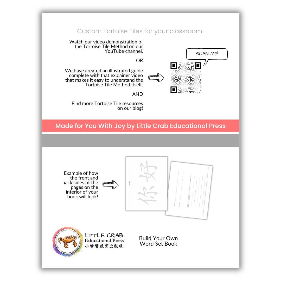 Love the idea of Tortoise Tiles but don't need any more of the word sets we've curated for you? This product allows you to have your very own Mandarin vocabulary word set* produced as a physical book of Tortoise Tiles (showing the guide for the characters on the front of each page and the space for translation and pronunciation notes on the back side) - sure to become your new favourite, super flexible and engaging classroom tool!
