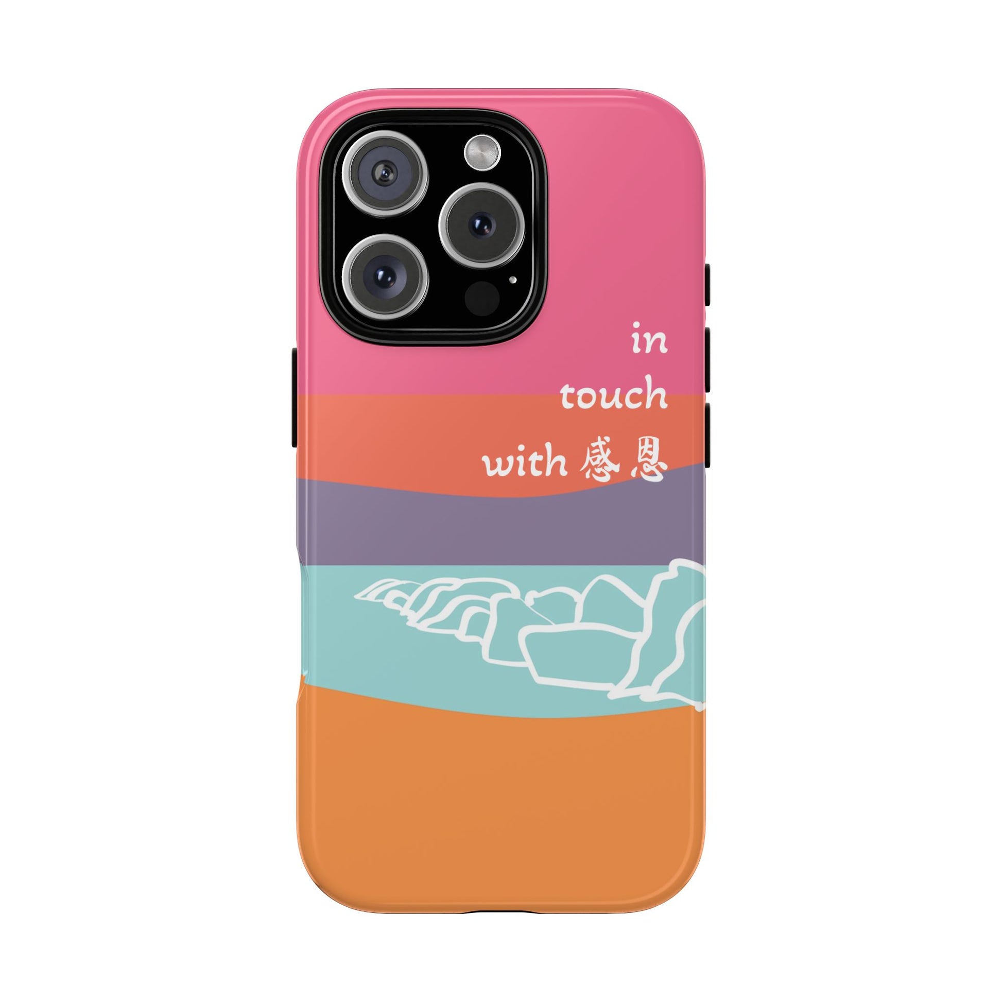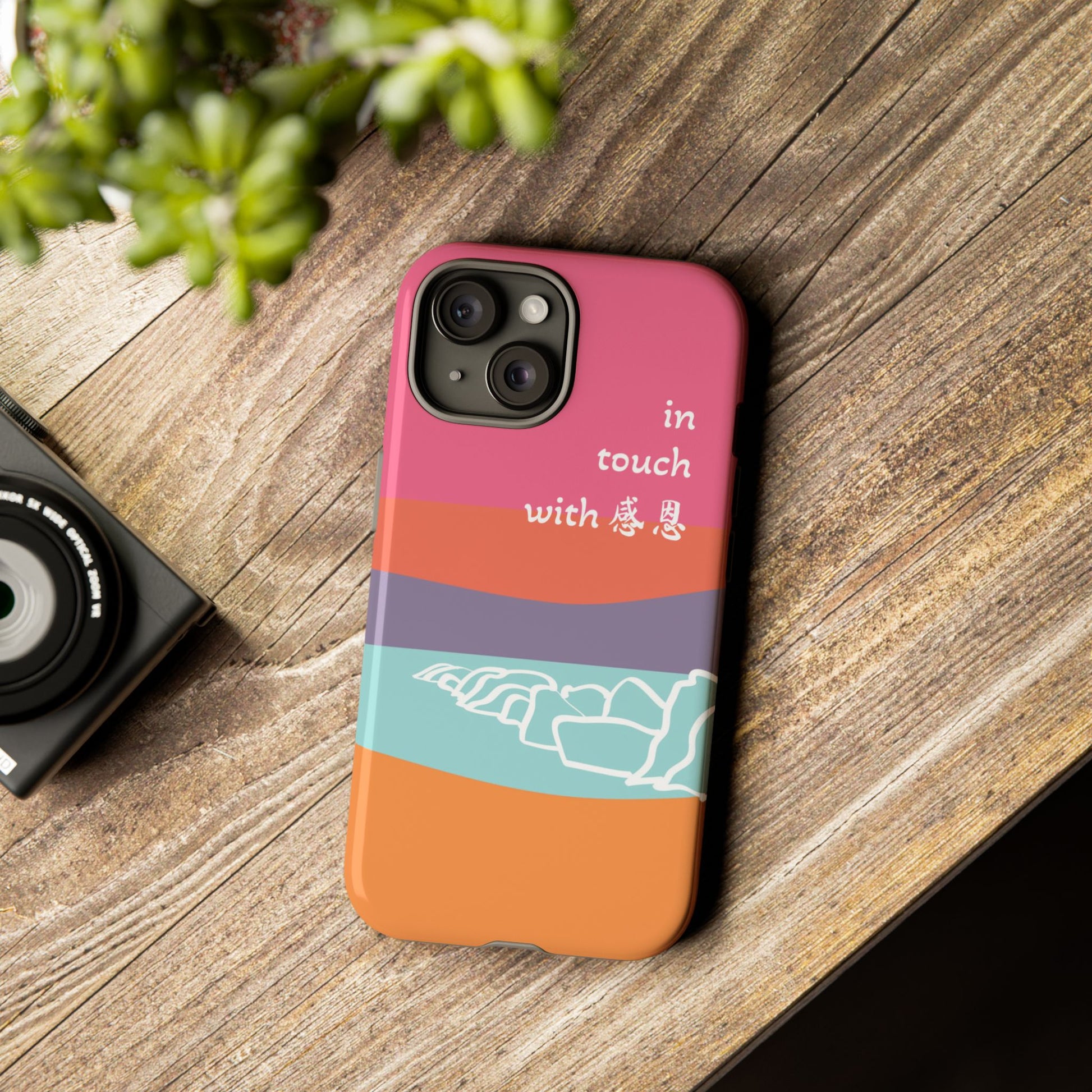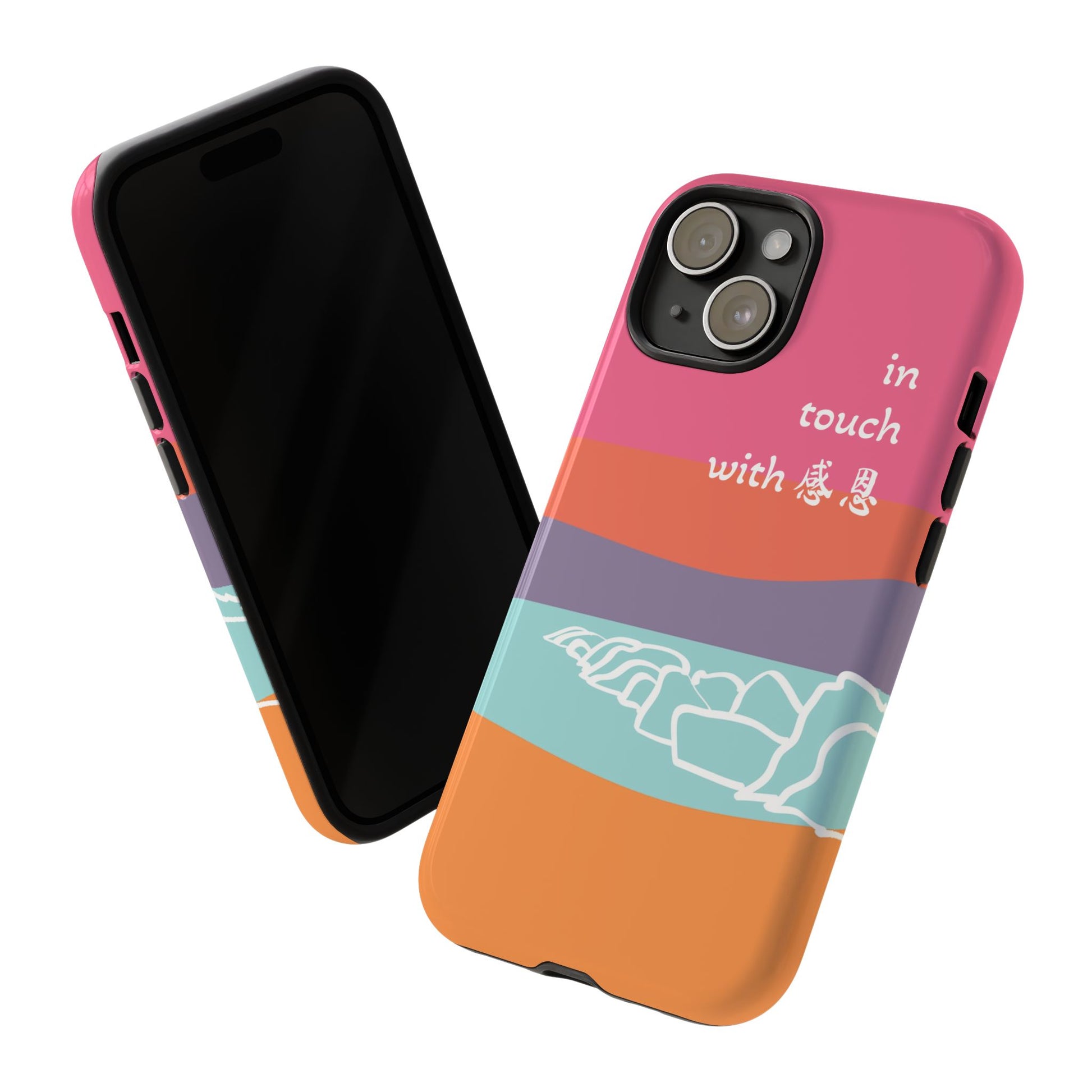 A durable and impact-resistant phone case featuring a hand-illustrated colour-blocked west coast beach motif with a 感恩 message. Perfect for adults and young adults who appreciate unique, artistic designs and want to protect their phone in style. Ideal for gifting on birthdays, holidays, or as a thank you gesture.