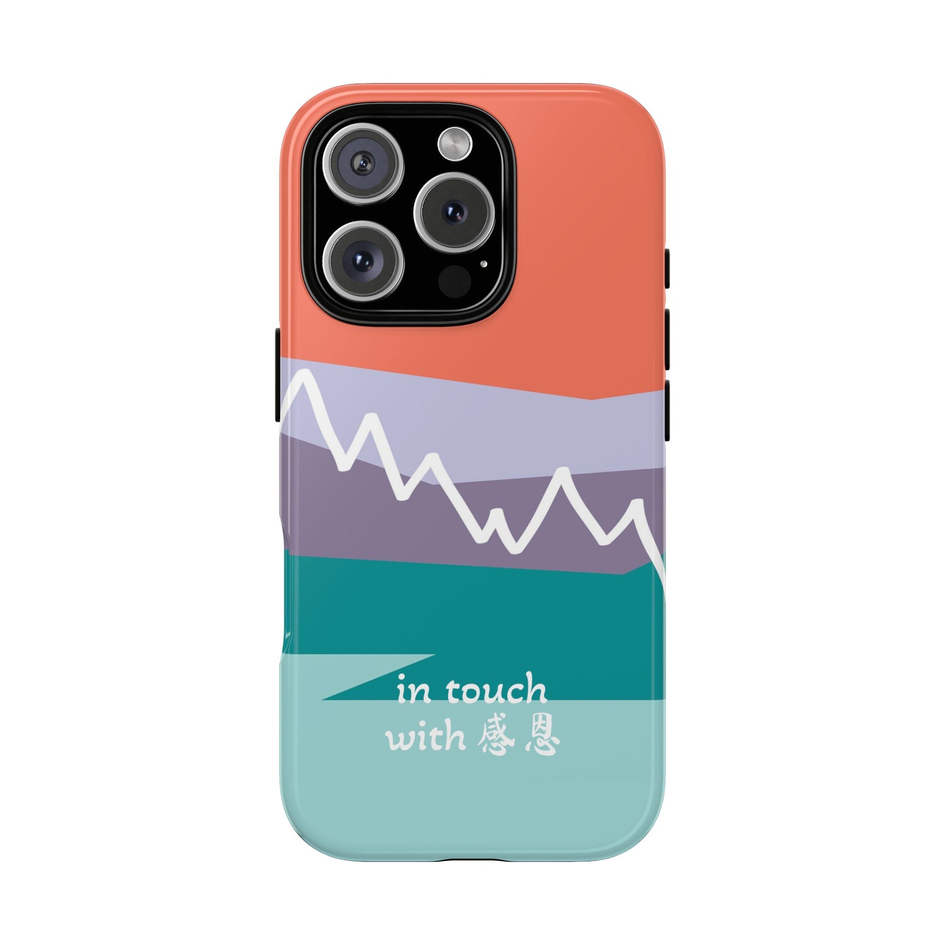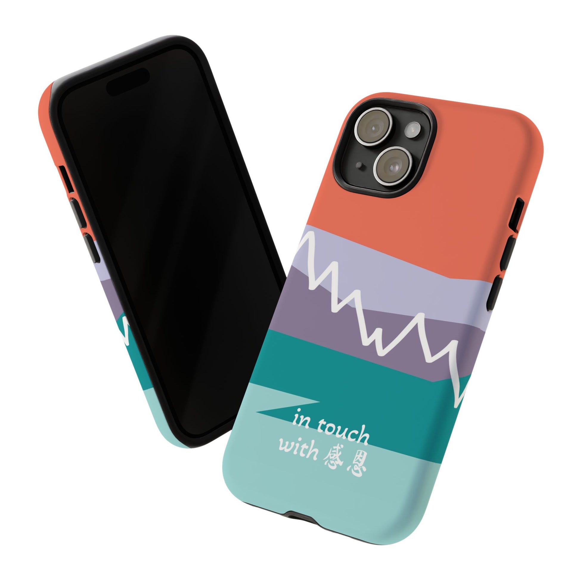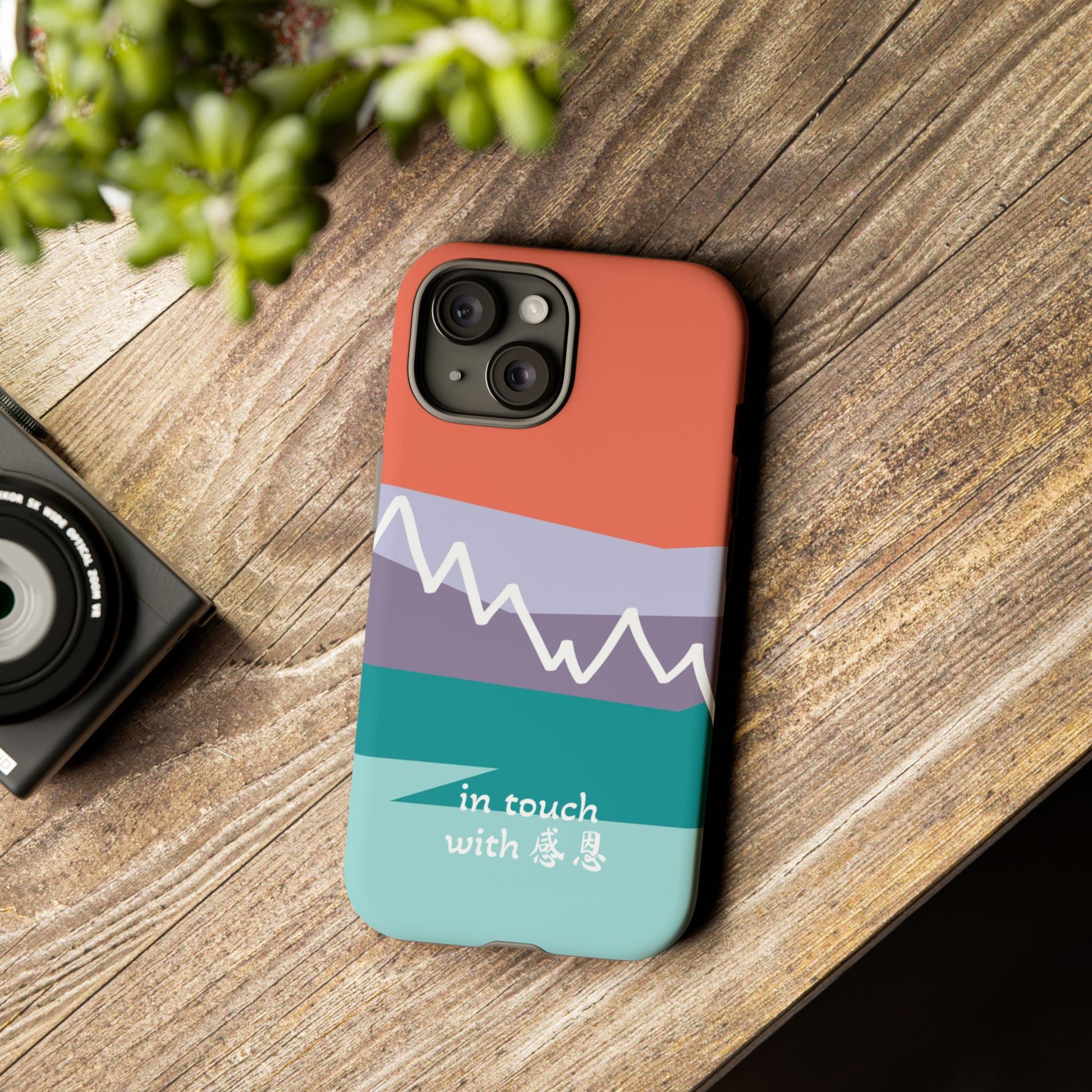A durable and impact-resistant phone case featuring a hand-illustrated colour-blocked west coast mountain motif with a 感恩 message. Perfect for adults and young adults who appreciate unique, artistic designs and want to protect their phone in style. Ideal for gifting on birthdays, holidays, or as a thank you gesture.
