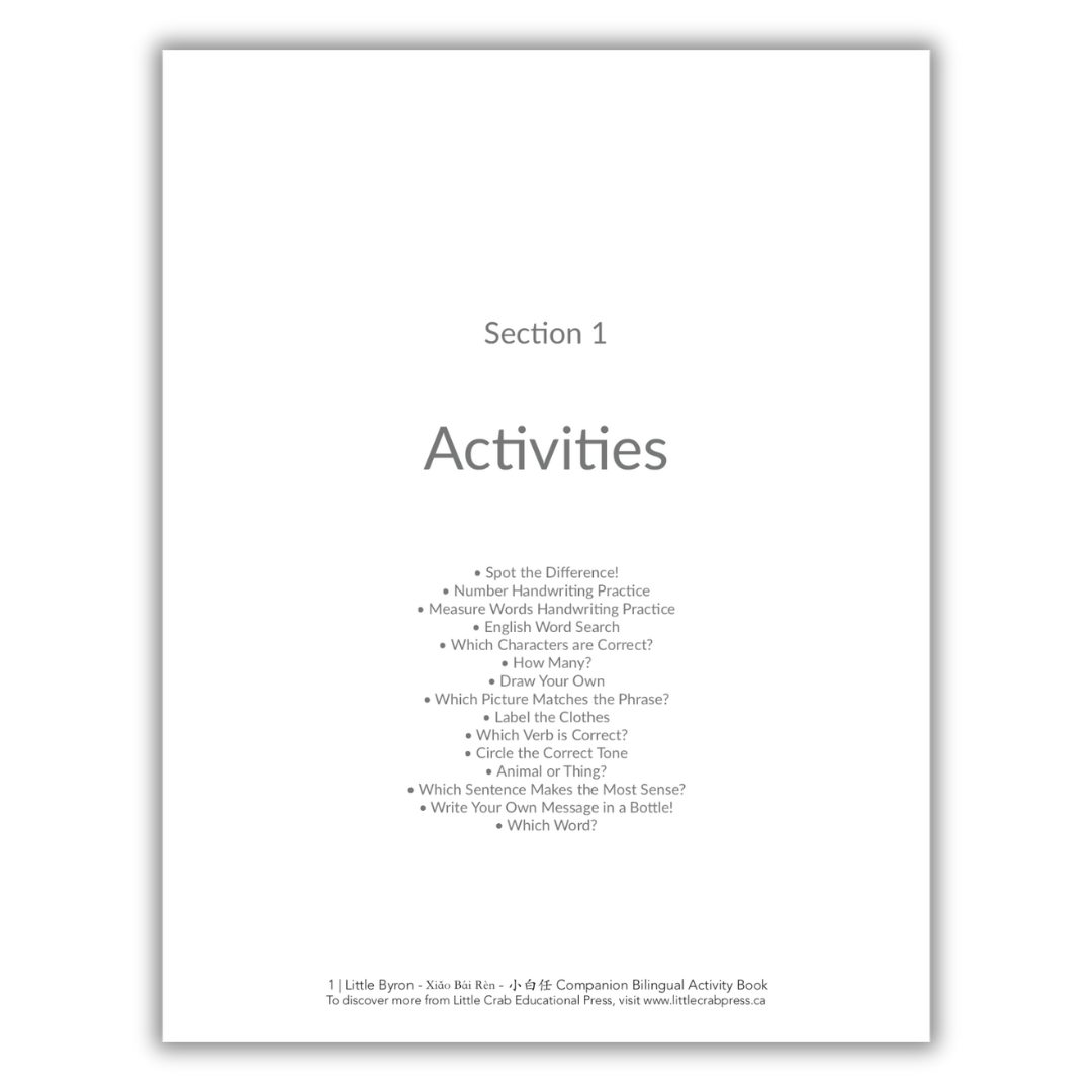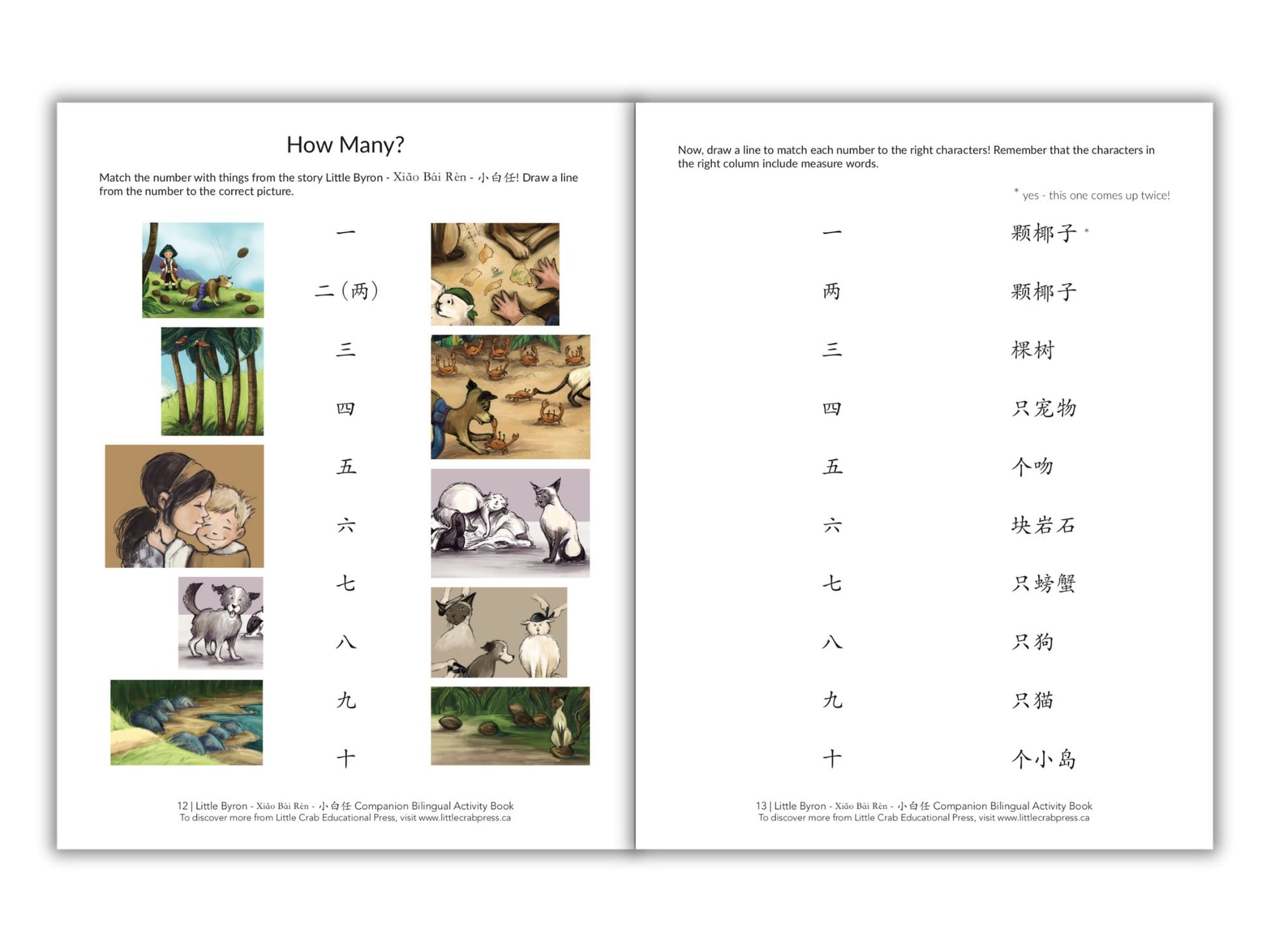 This full colour activity book accompaniment to the storybook Little Byron - Xiǎo Bái Rèn - 小白任 helps children and beginner language learners of Mandarin or English, of all ages, to exercise observational skills, focus on vocabulary building, practice character handwriting for the numbers 1-10 and measure words, exercise verbal reasoning skills... And much more!