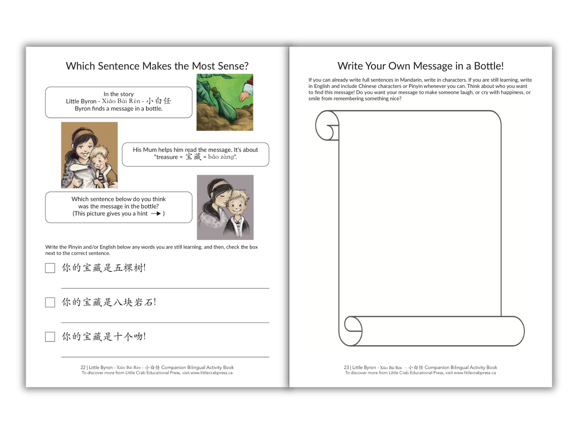 This full-colour activity book is one of 4 books made to complement our beloved bilingual (English and Mandarin with Pinyin) children's book, Little Byron - Xiǎo Bái Rèn - 小白任. For children and beginning learners of all ages working on their Mandarin reading comprehension, character handwriting practice, composition skills, pattern recognition and so much more.