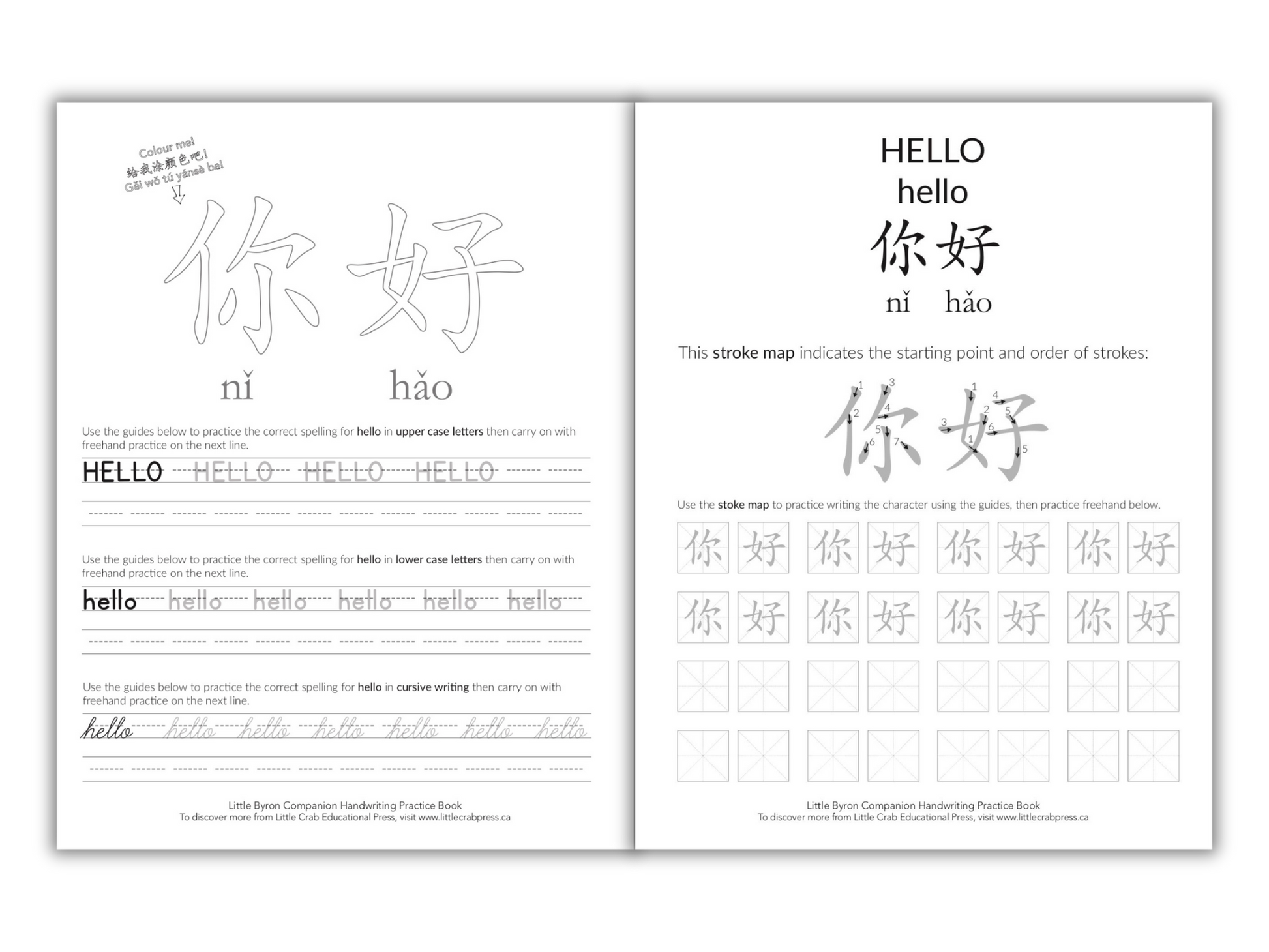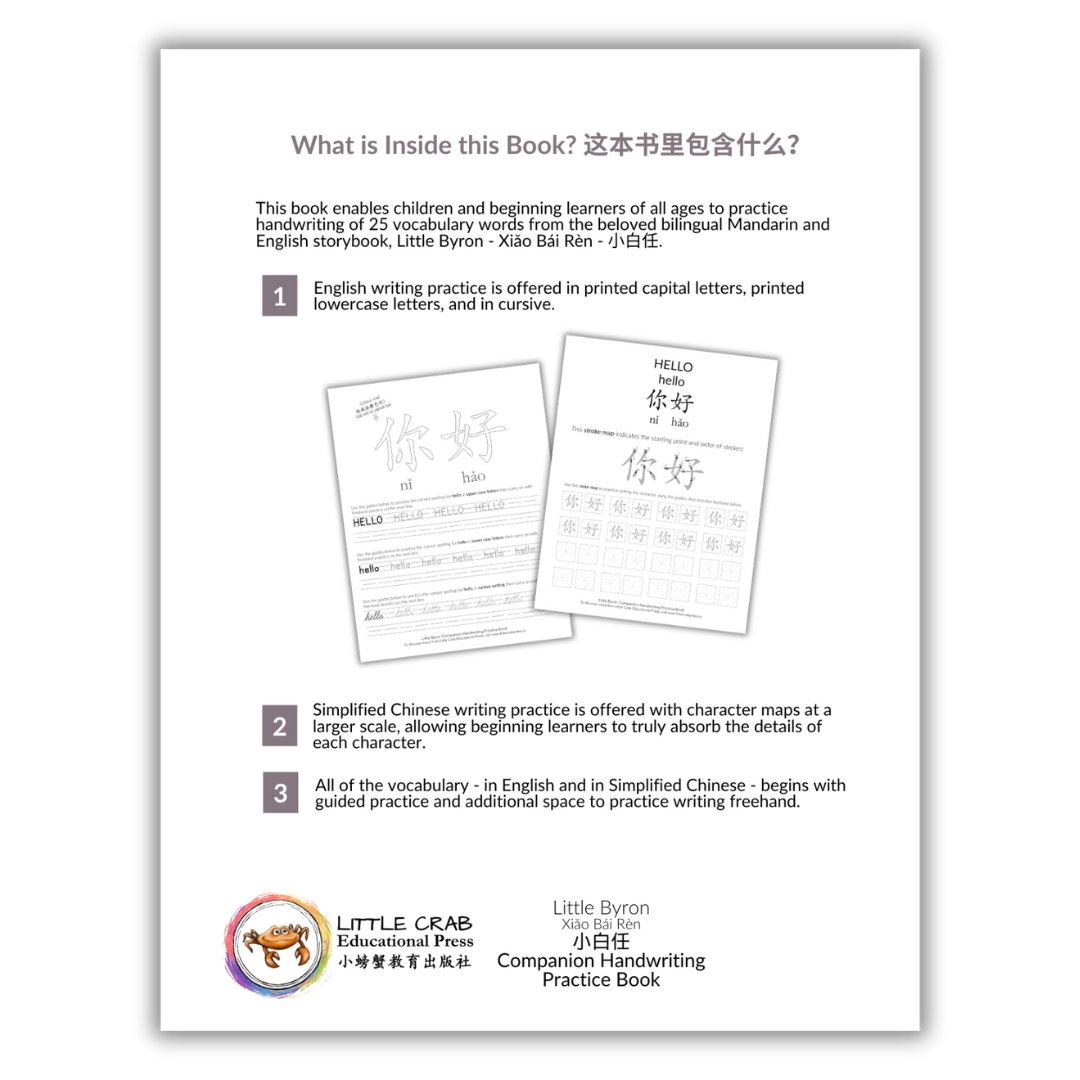 This handwriting practice book is one of 4 books made to complement our beloved bilingual (English and Mandarin with Pinyin) children's book, Little Byron - Xiǎo Bái Rèn - 小白任. For children and beginning learners of all ages working on their English or Simplified Chinese handwriting, learning new character is a joy with this workbook.