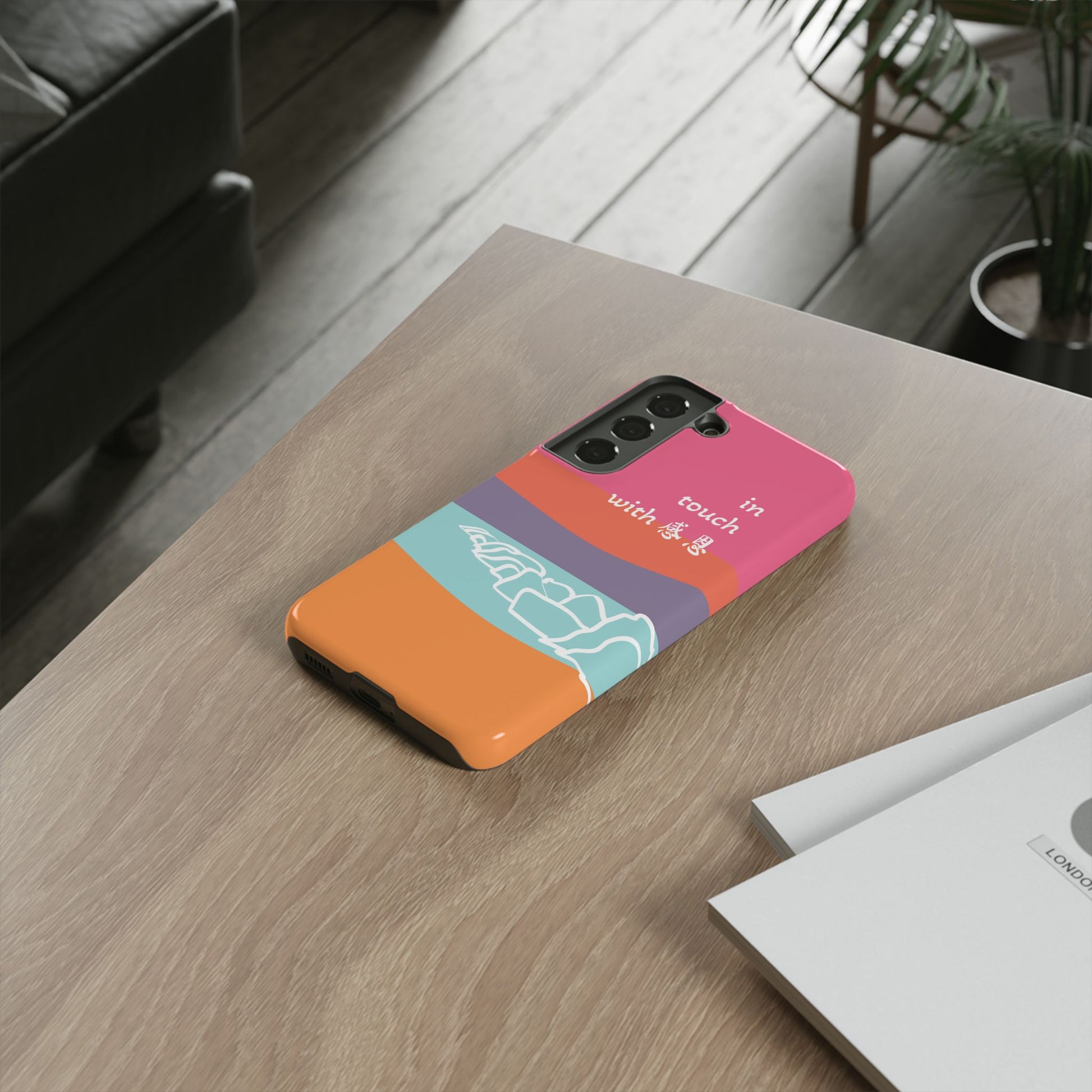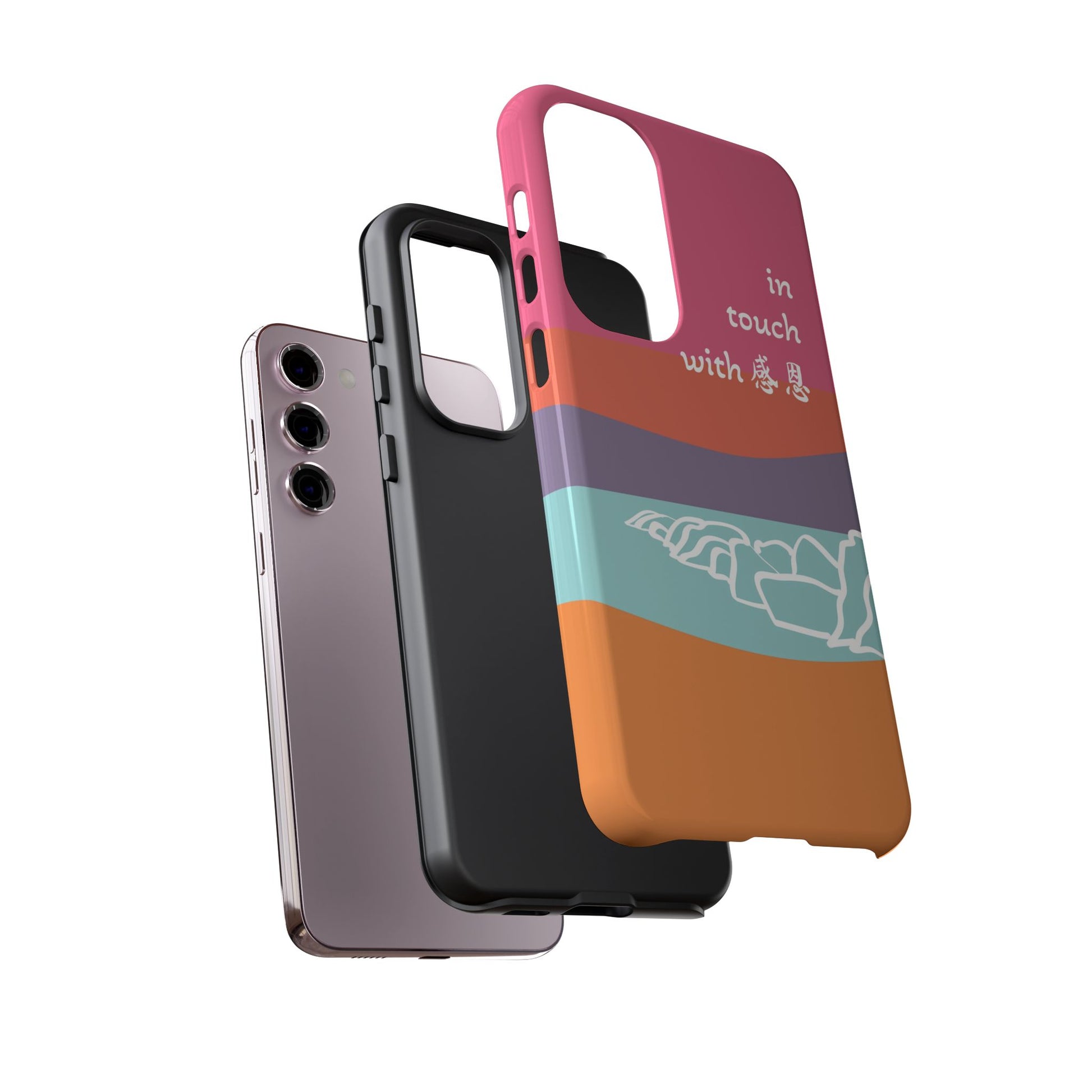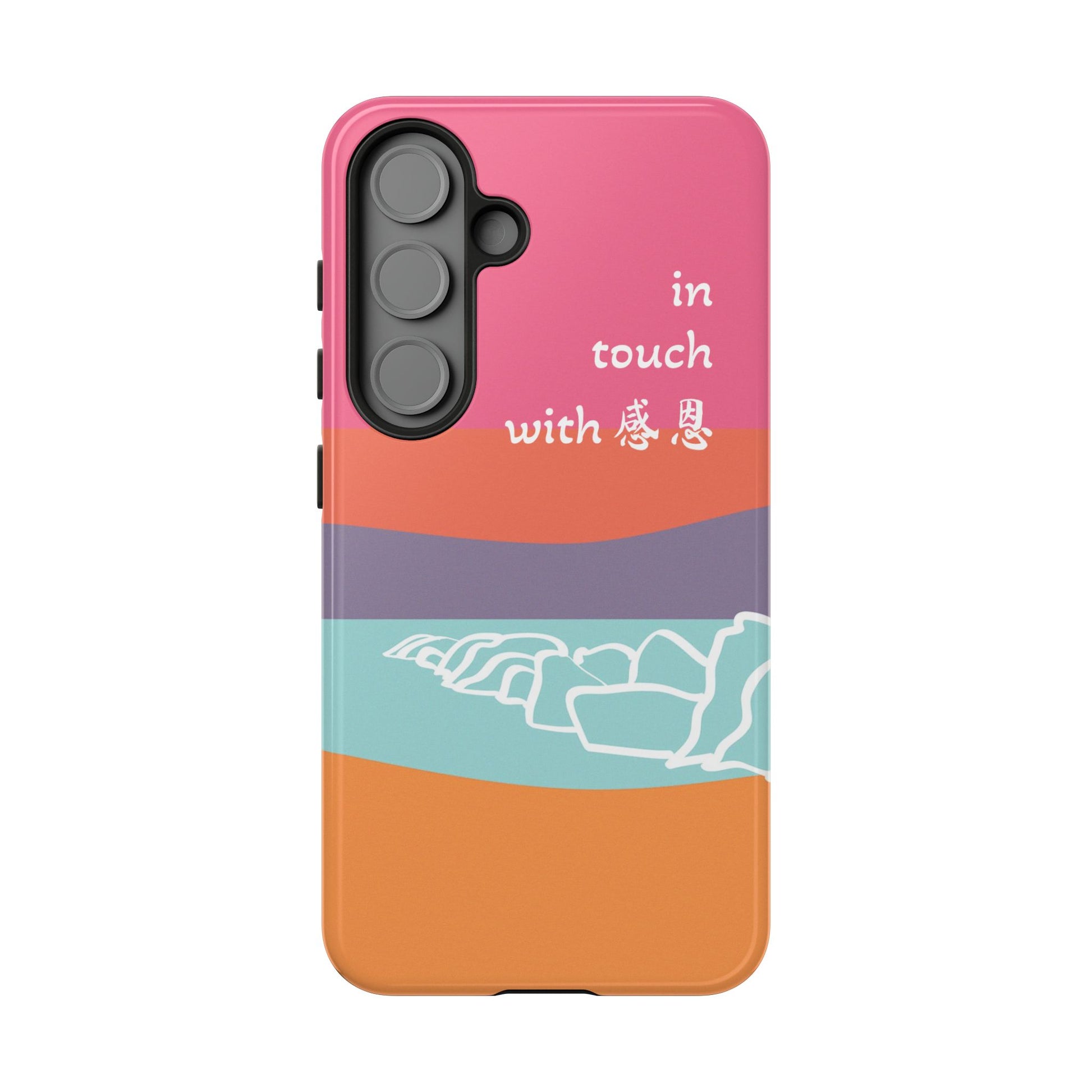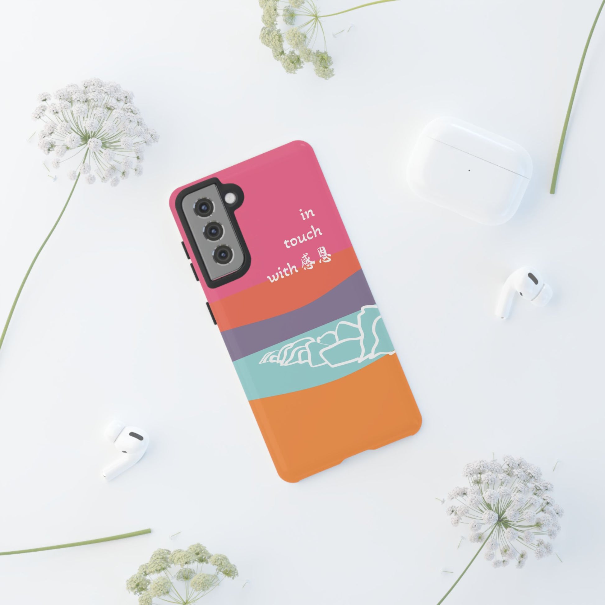 A durable and impact-resistant phone case featuring a hand-illustrated colour-blocked west coast beach motif with a 感恩 message. Perfect for adults and young adults who appreciate unique, artistic designs and want to protect their phone in style. Ideal for gifting on birthdays, holidays, or as a thank you gesture.