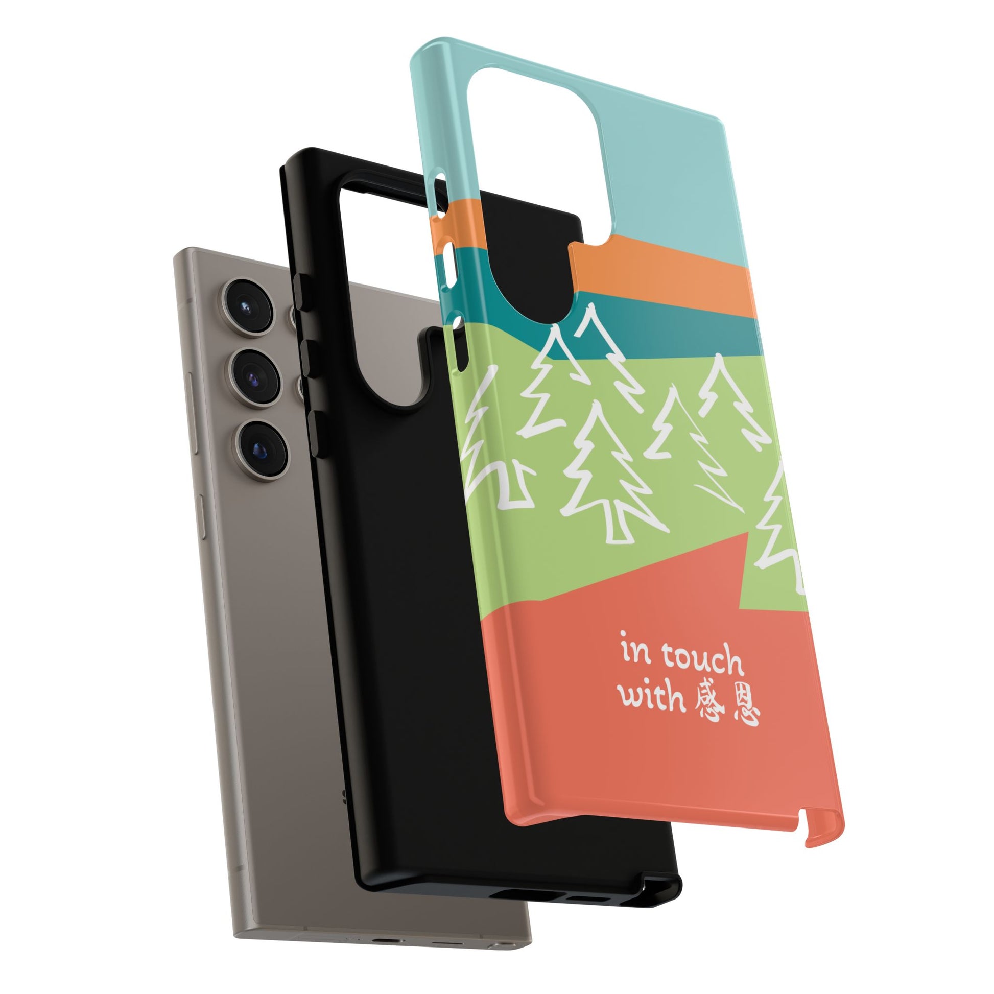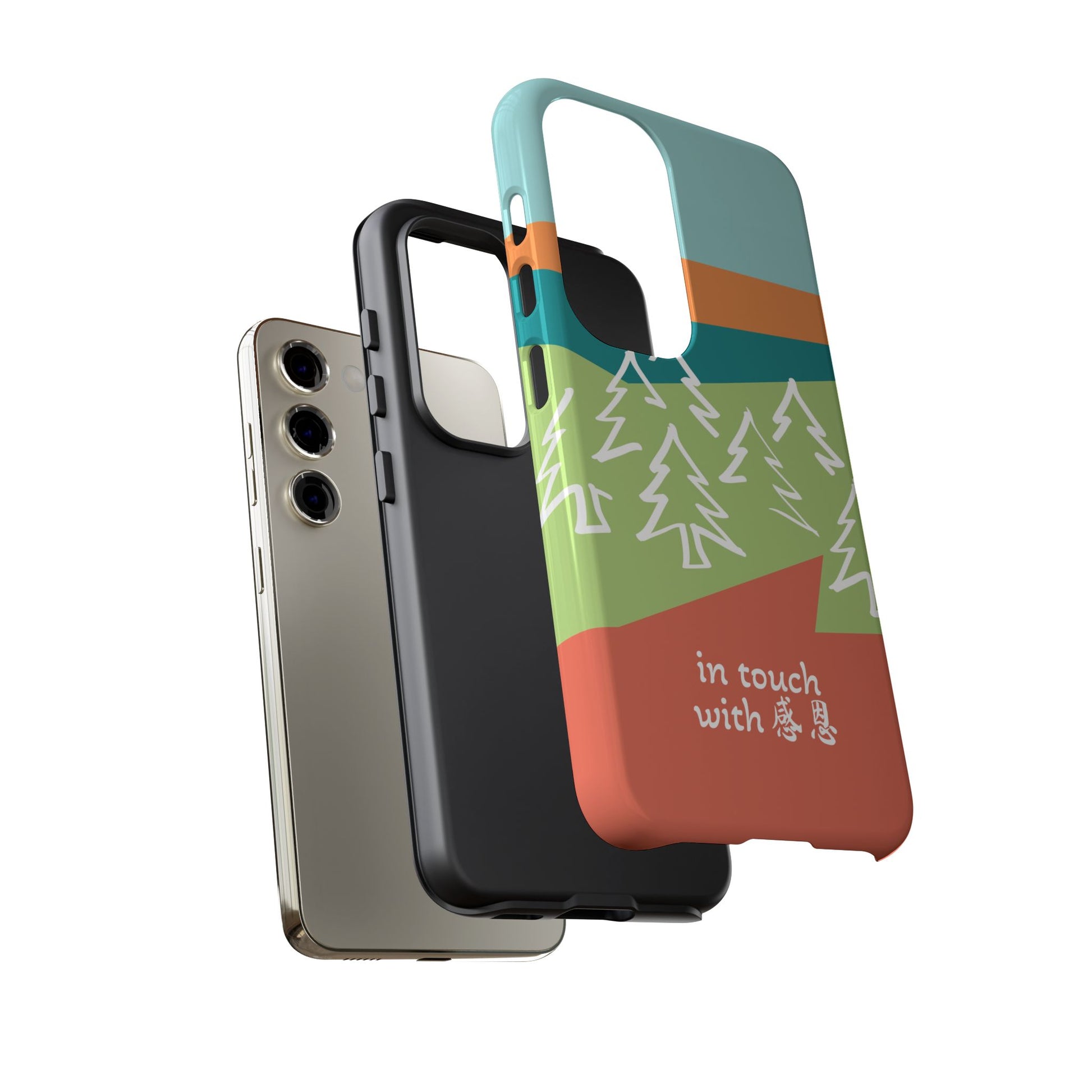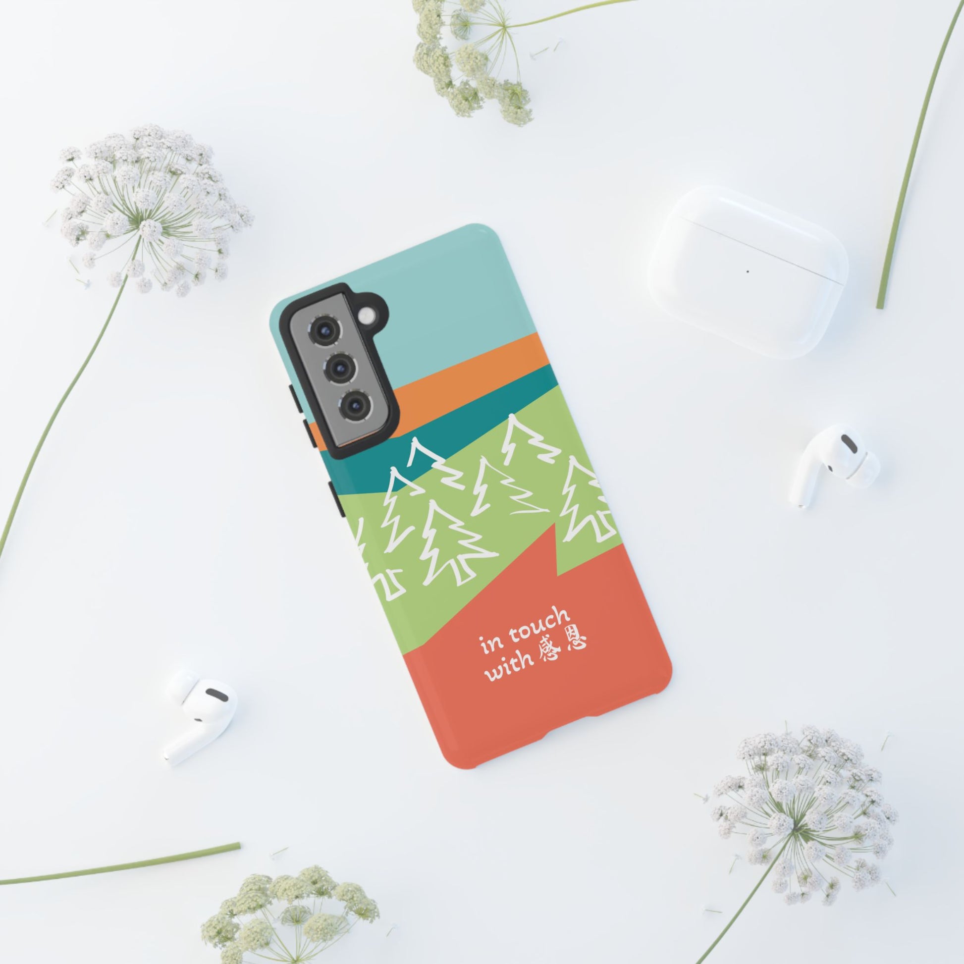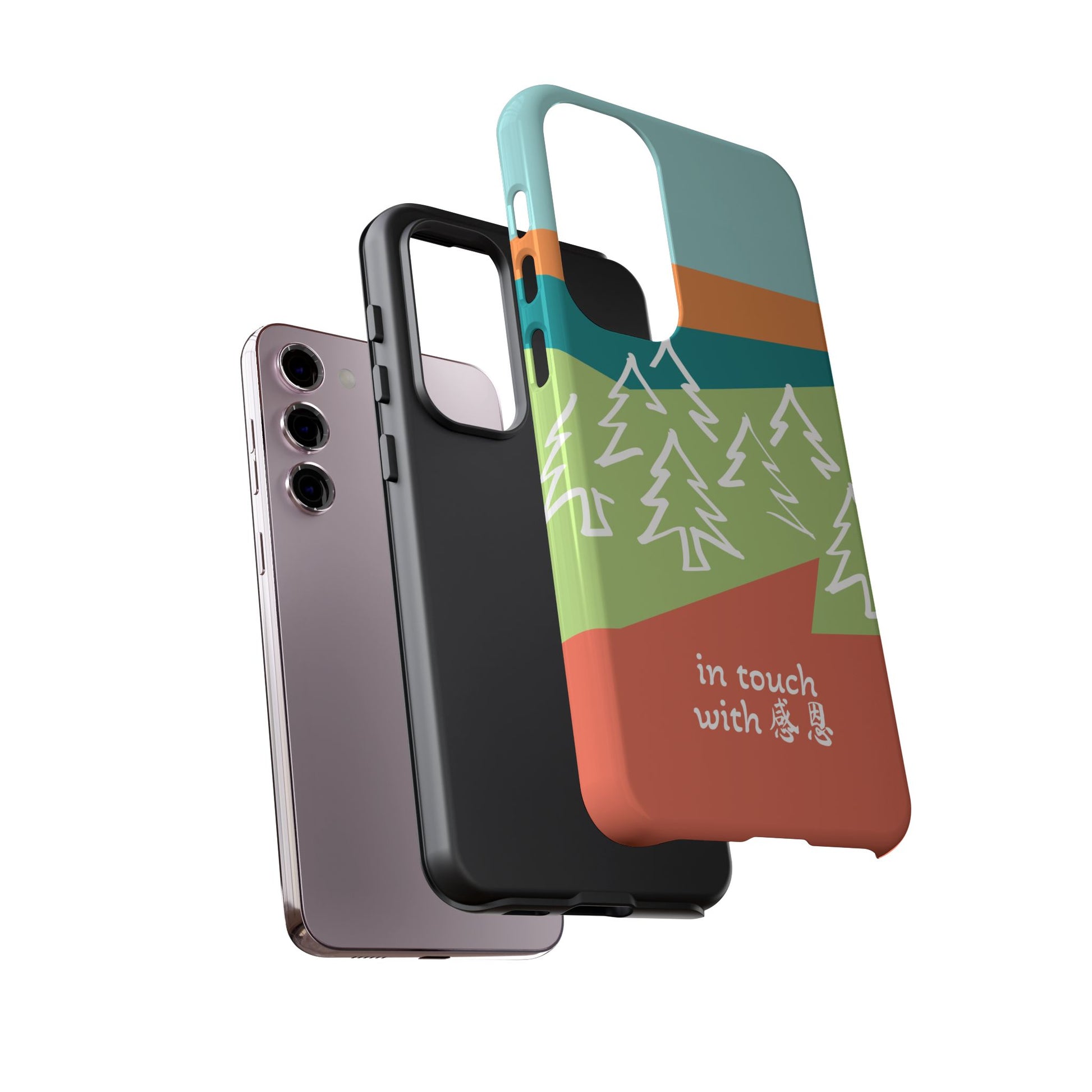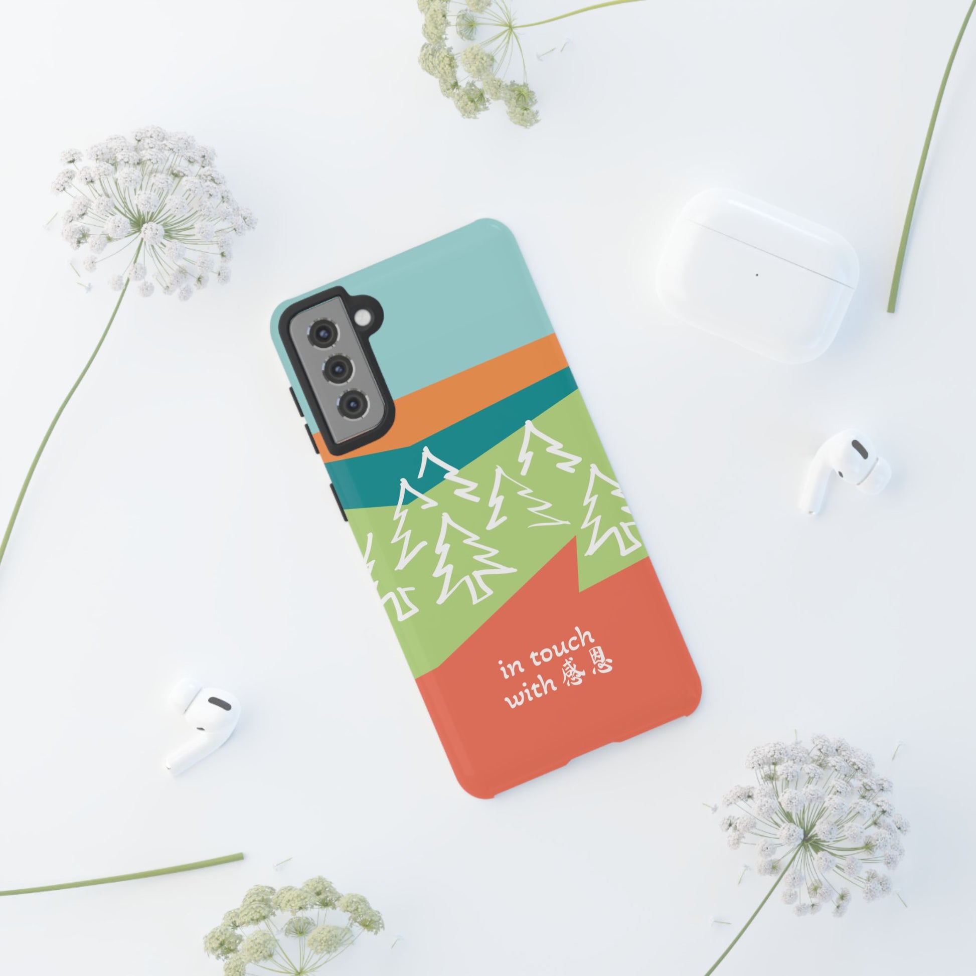 A durable and impact-resistant phone case featuring a hand-illustrated colour-blocked west coast forest motif with a 感恩 message. Perfect for adults and young adults who appreciate unique, artistic designs and want to protect their phone in style. Ideal for gifting on birthdays, holidays, or as a thank you gesture.