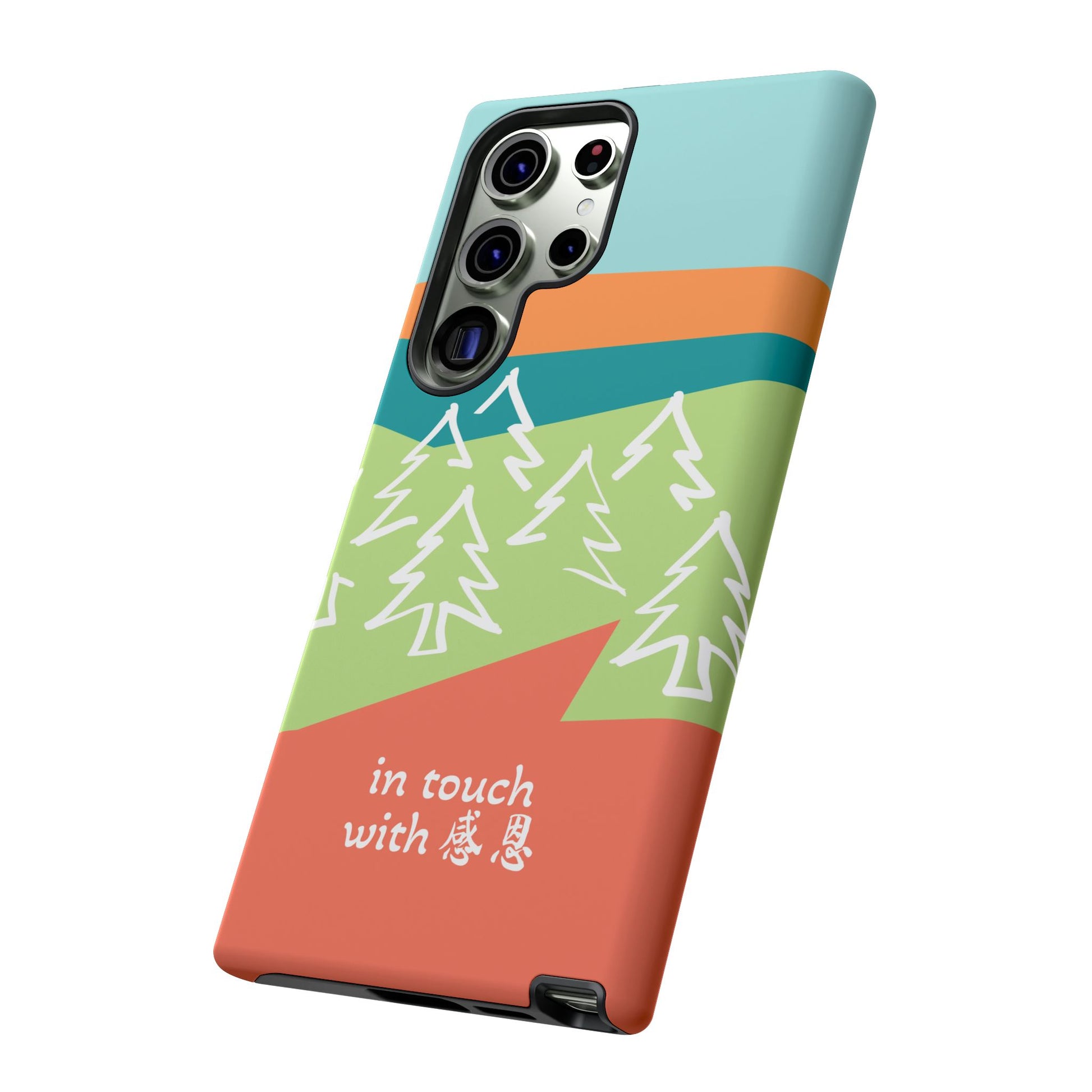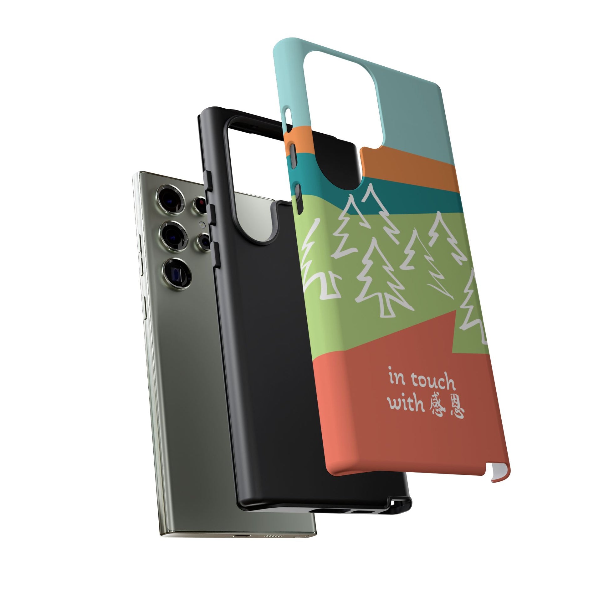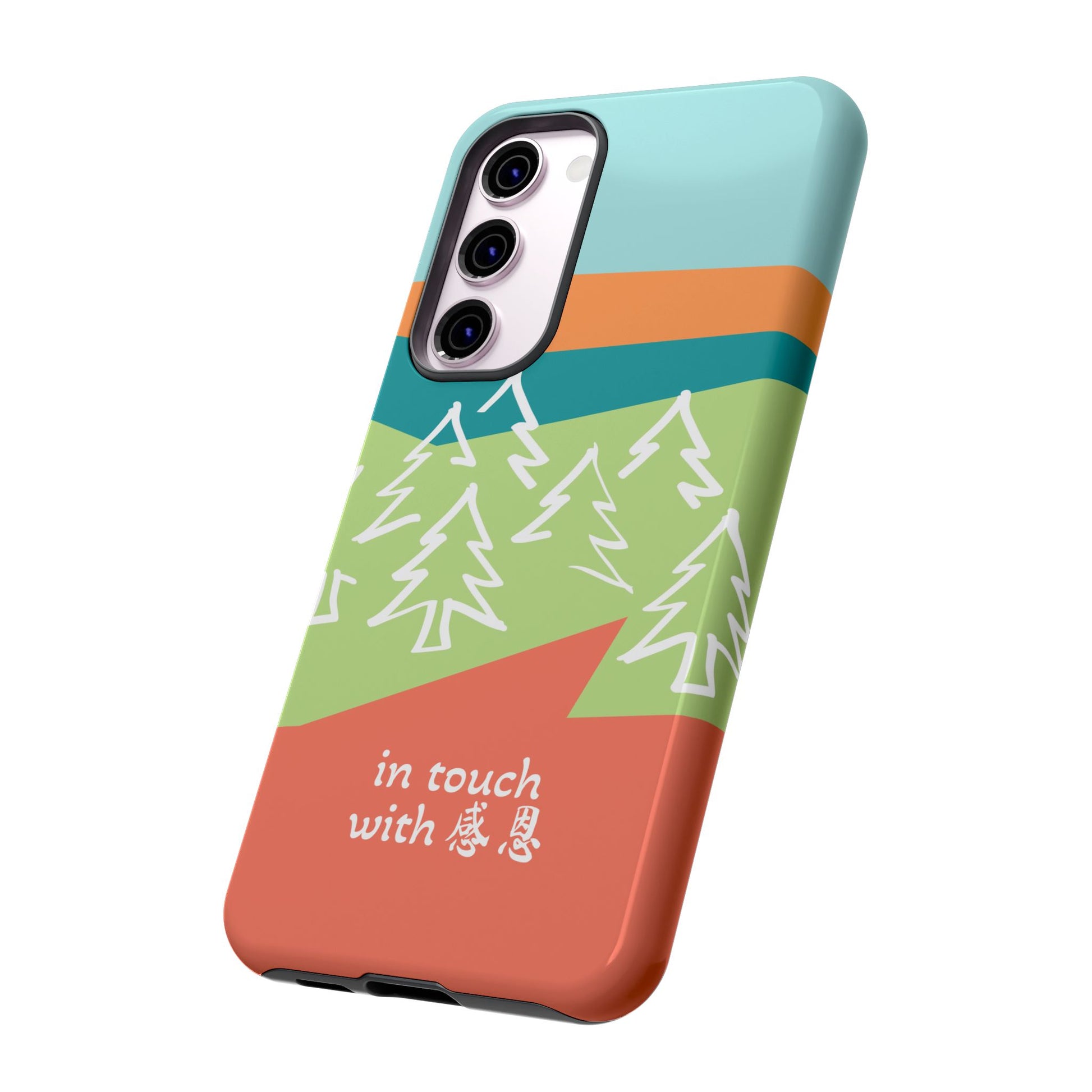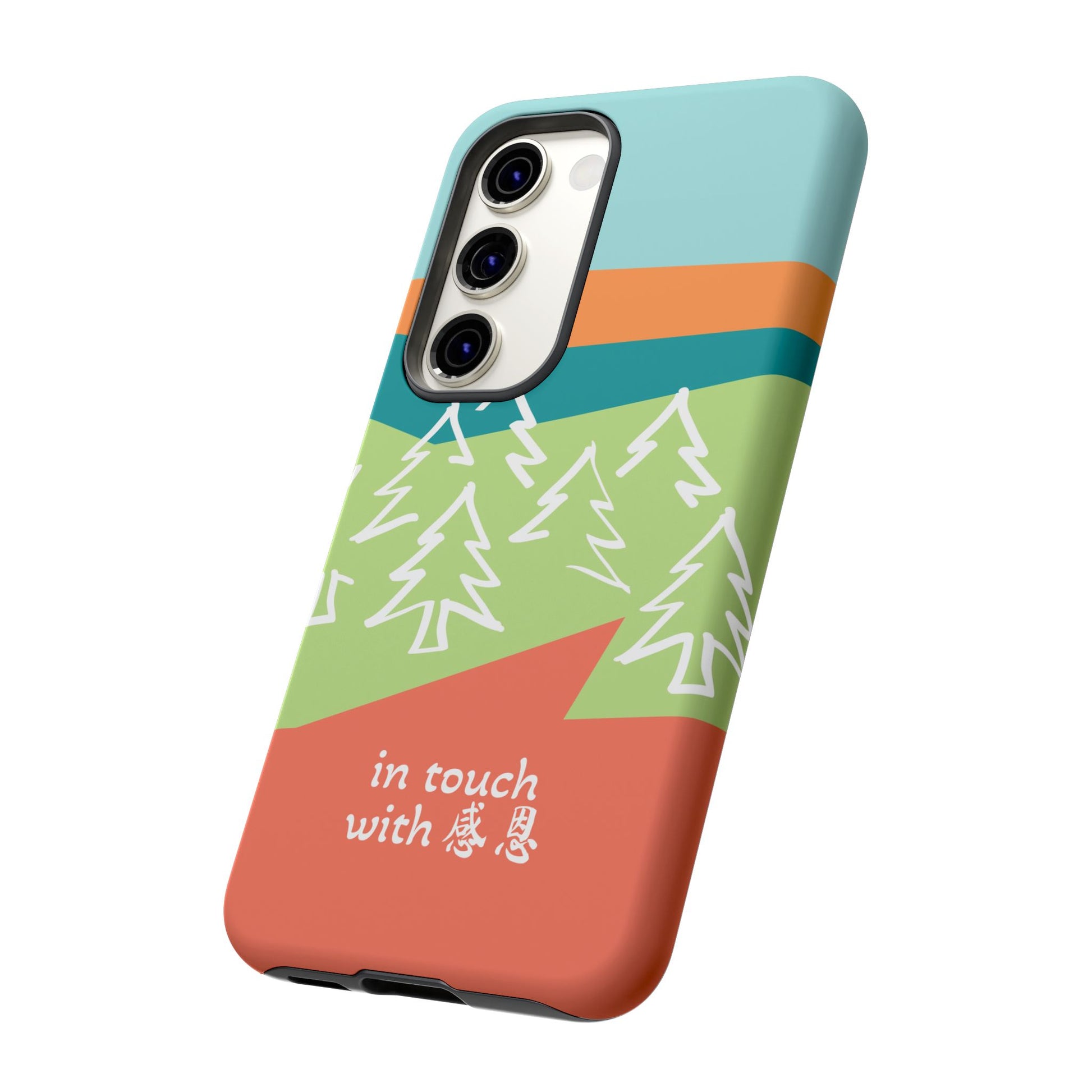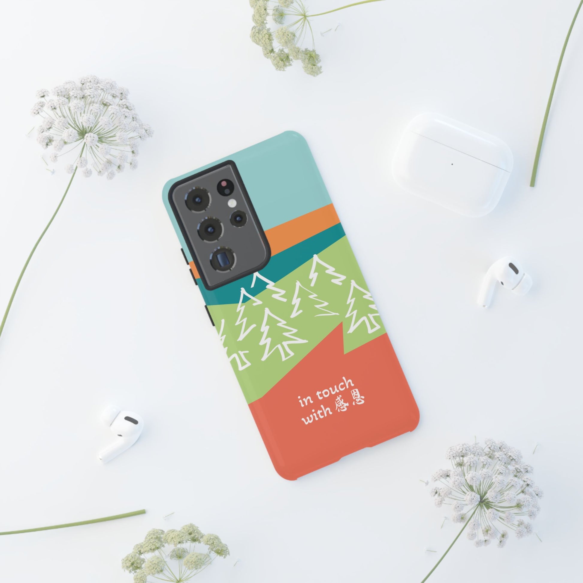 A durable and impact-resistant phone case featuring a hand-illustrated colour-blocked west coast forest motif with a 感恩 message. Perfect for adults and young adults who appreciate unique, artistic designs and want to protect their phone in style. Ideal for gifting on birthdays, holidays, or as a thank you gesture.