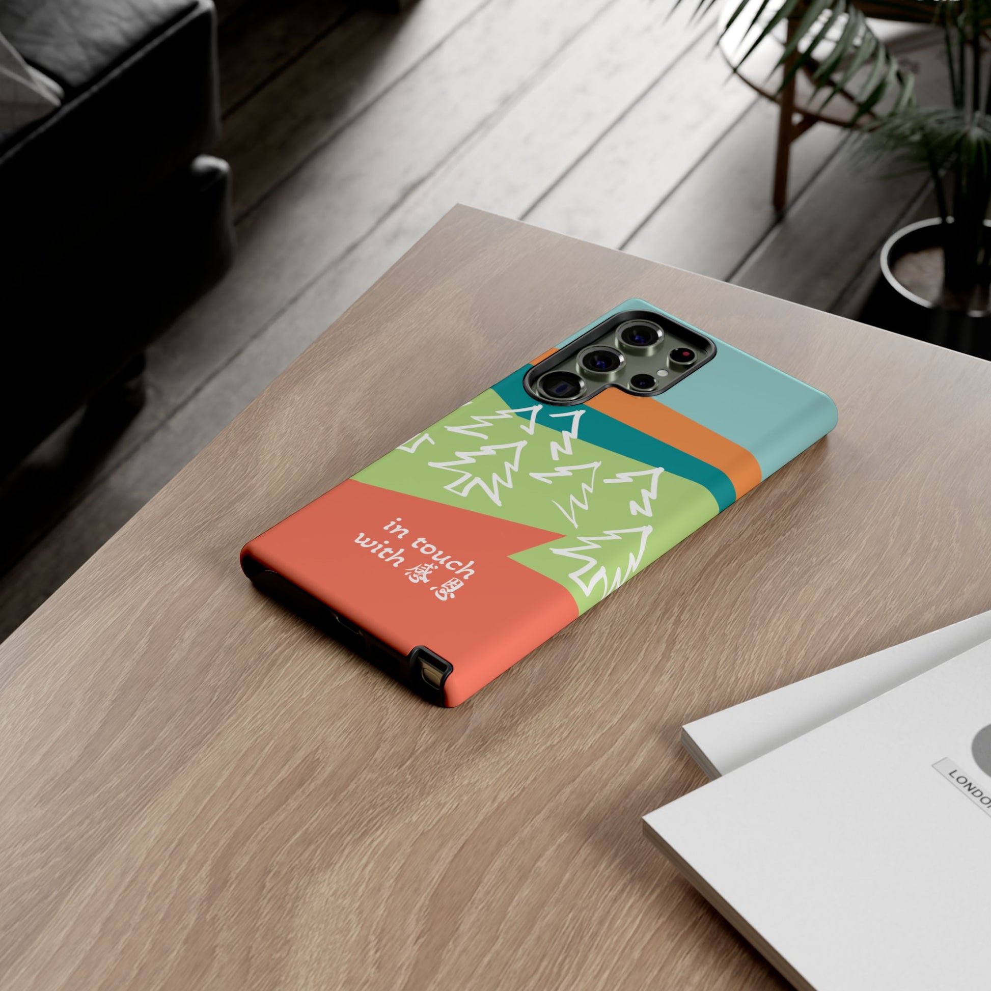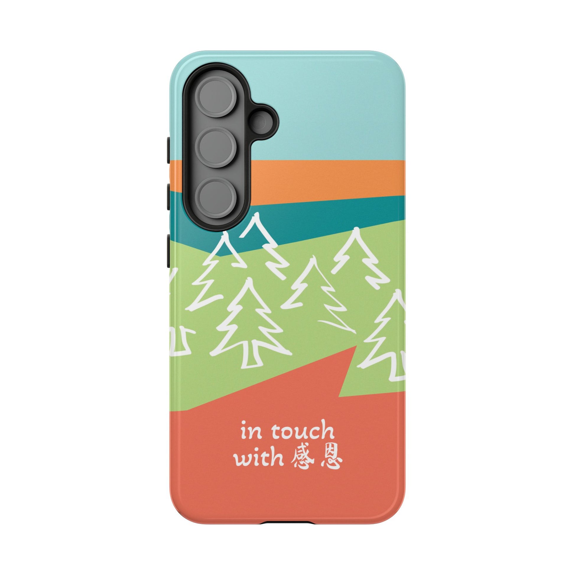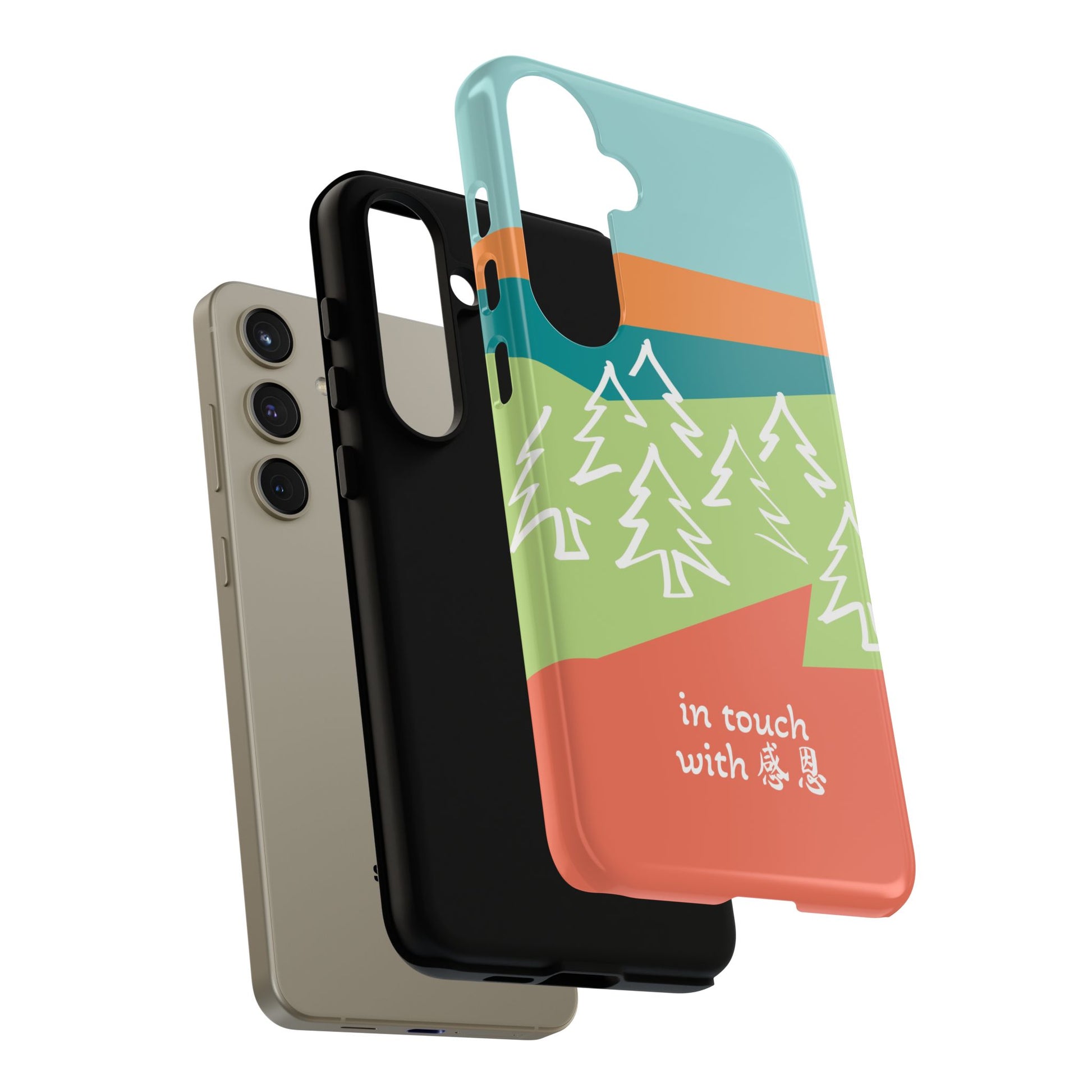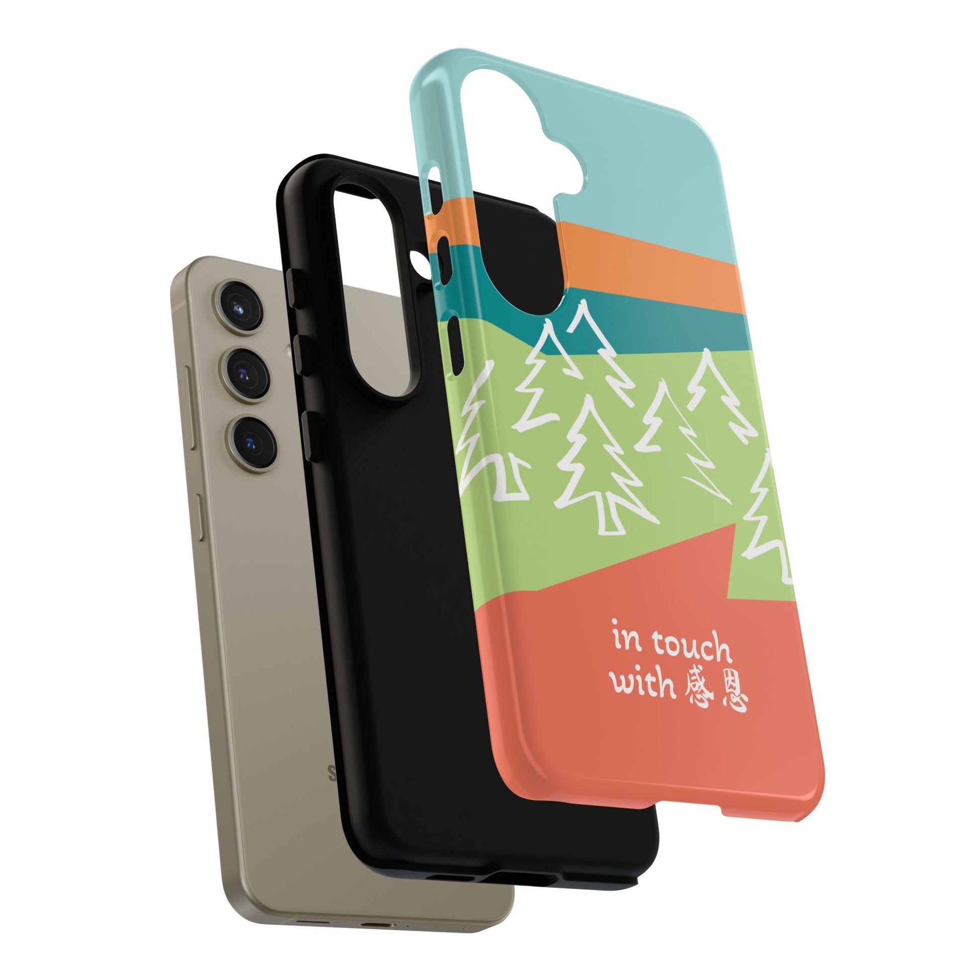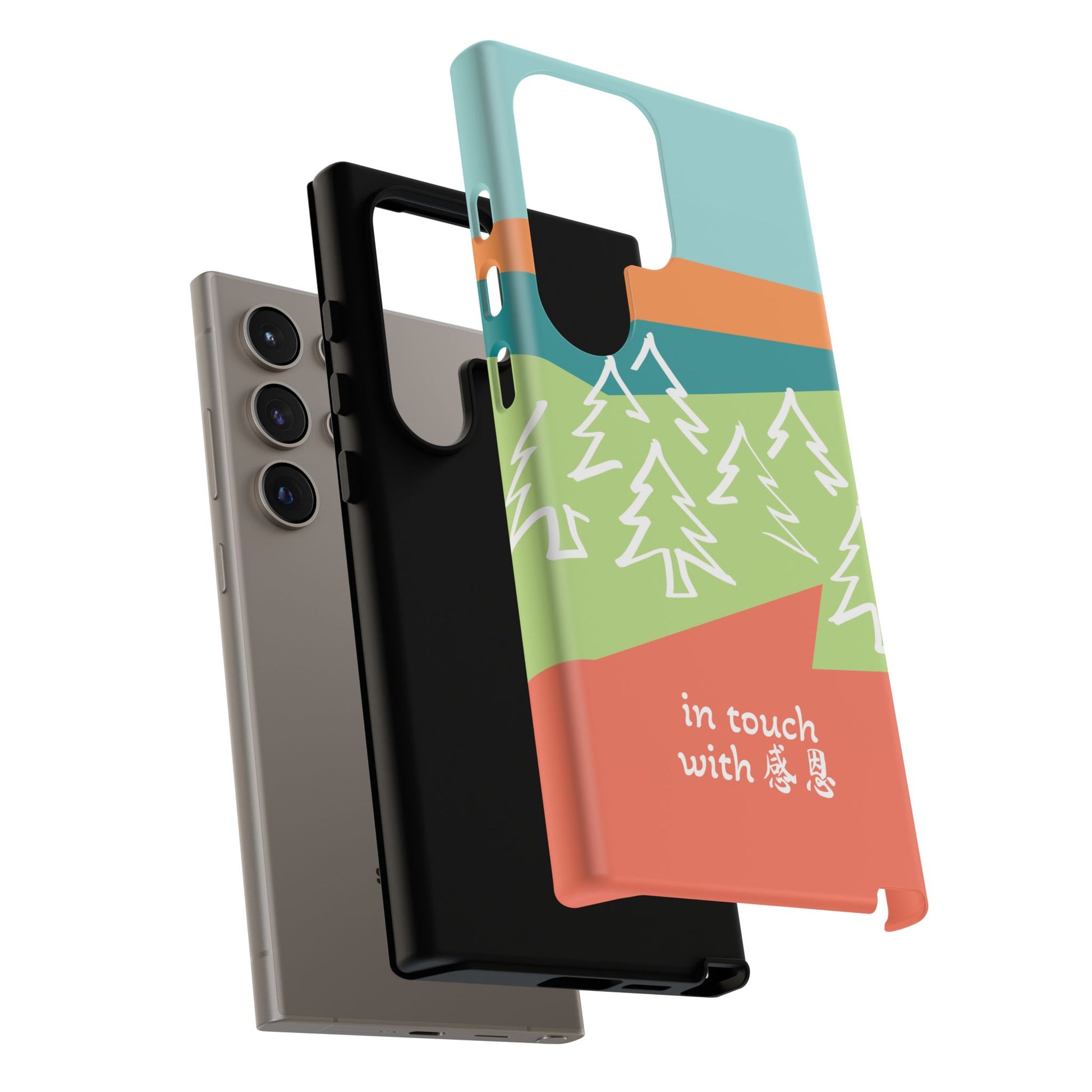 A durable and impact-resistant phone case featuring a hand-illustrated colour-blocked west coast forest motif with a 感恩 message. Perfect for adults and young adults who appreciate unique, artistic designs and want to protect their phone in style. Ideal for gifting on birthdays, holidays, or as a thank you gesture.