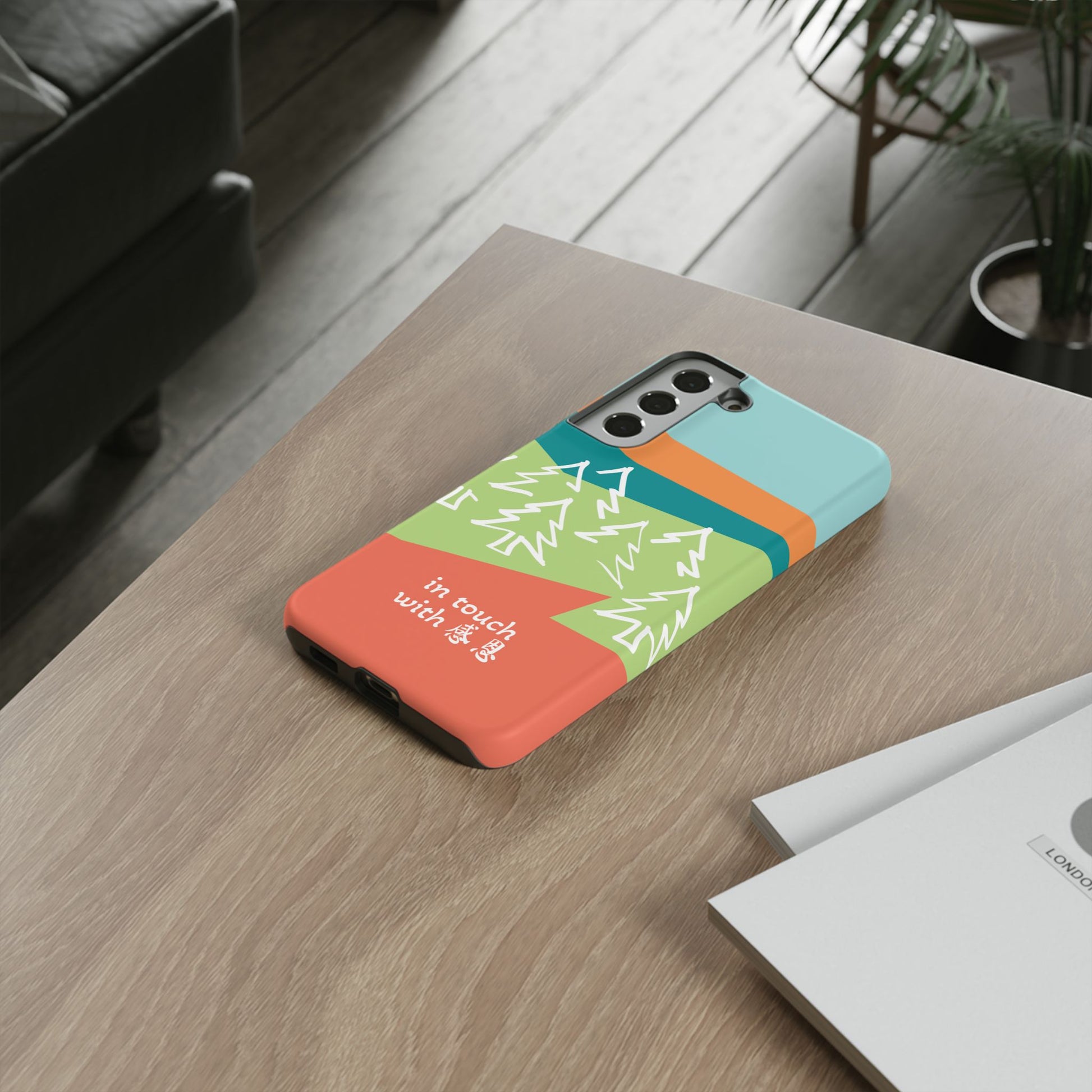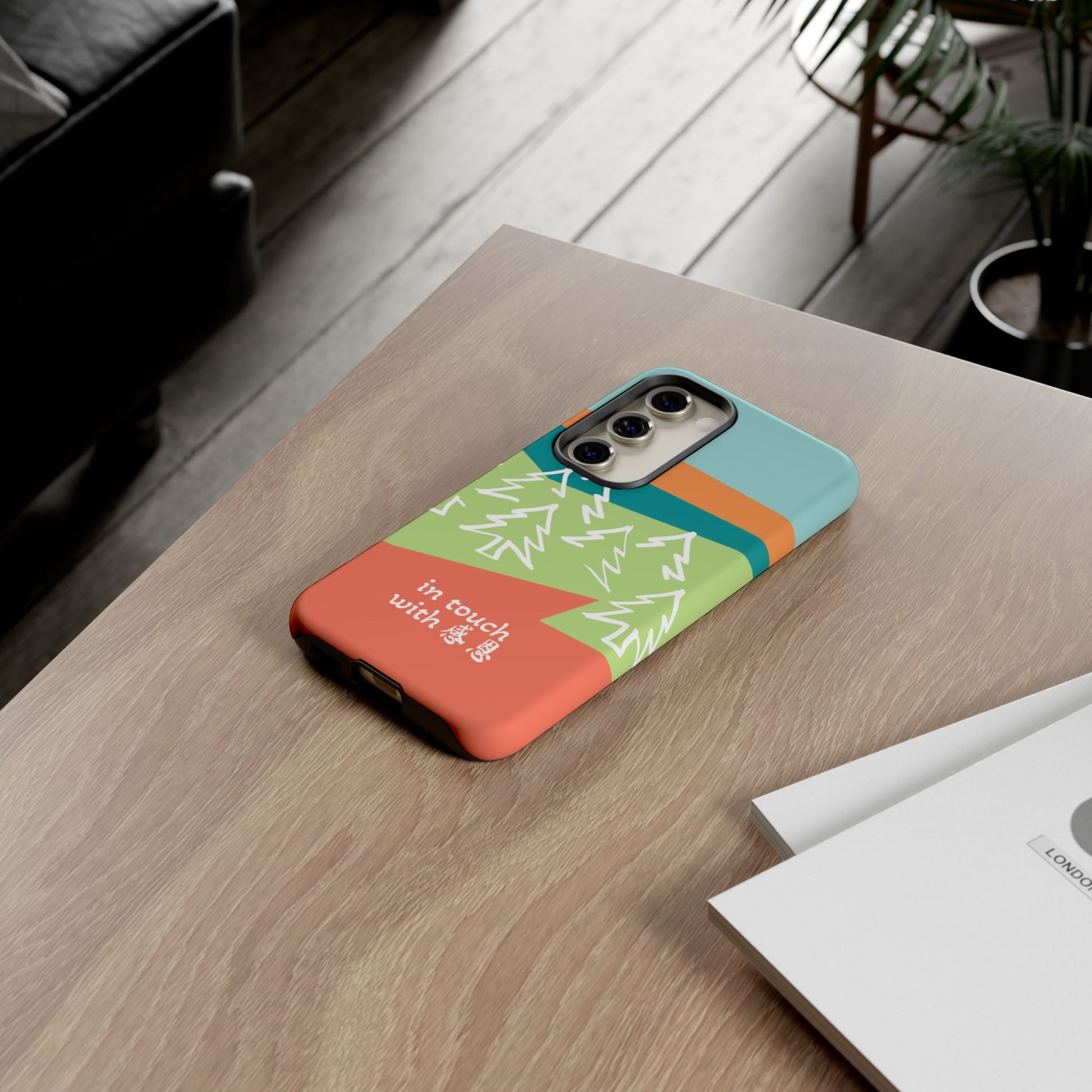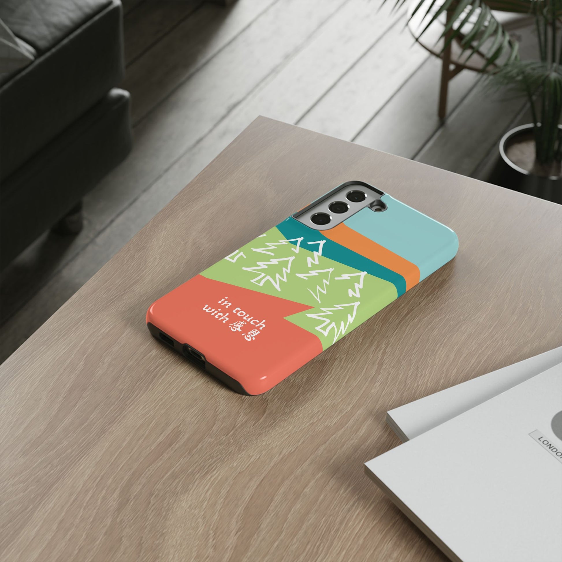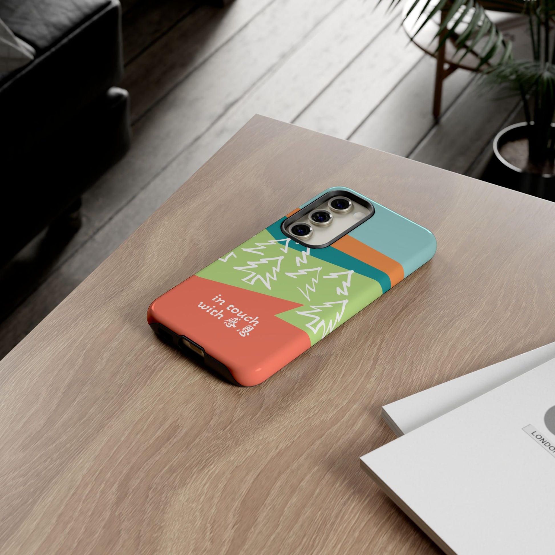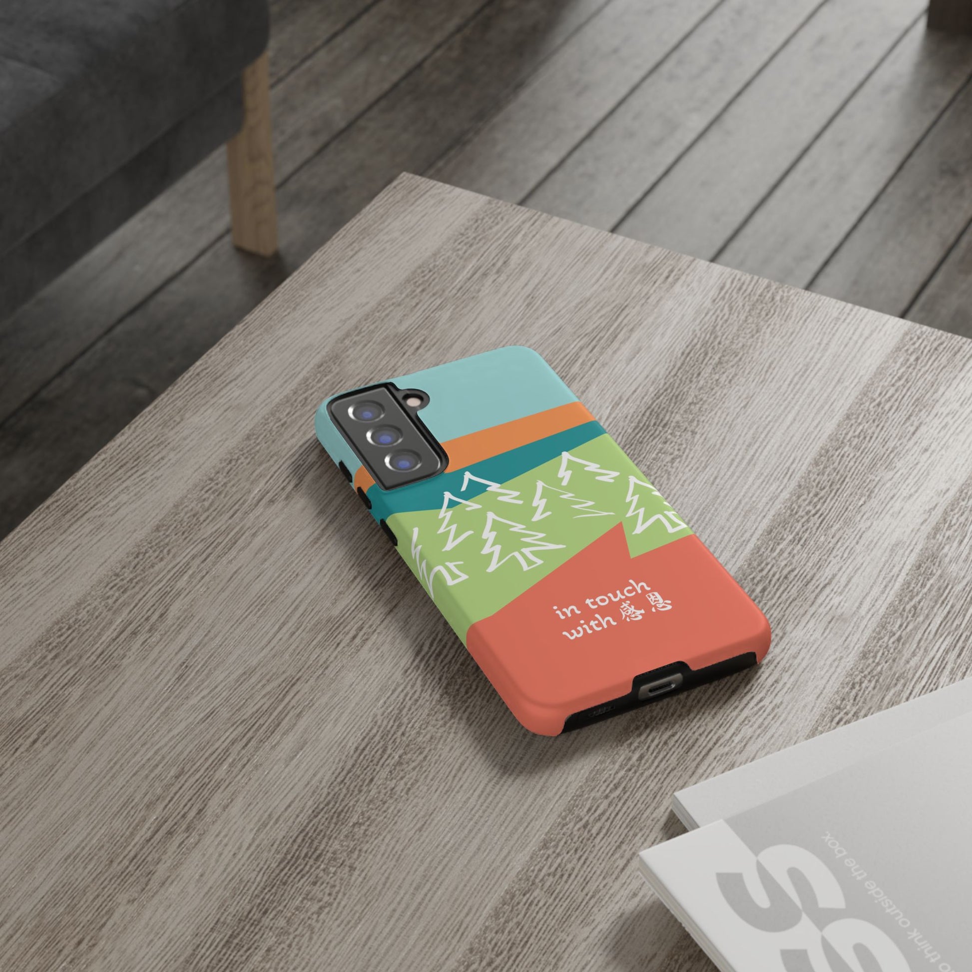 A durable and impact-resistant phone case featuring a hand-illustrated colour-blocked west coast forest motif with a 感恩 message. Perfect for adults and young adults who appreciate unique, artistic designs and want to protect their phone in style. Ideal for gifting on birthdays, holidays, or as a thank you gesture.