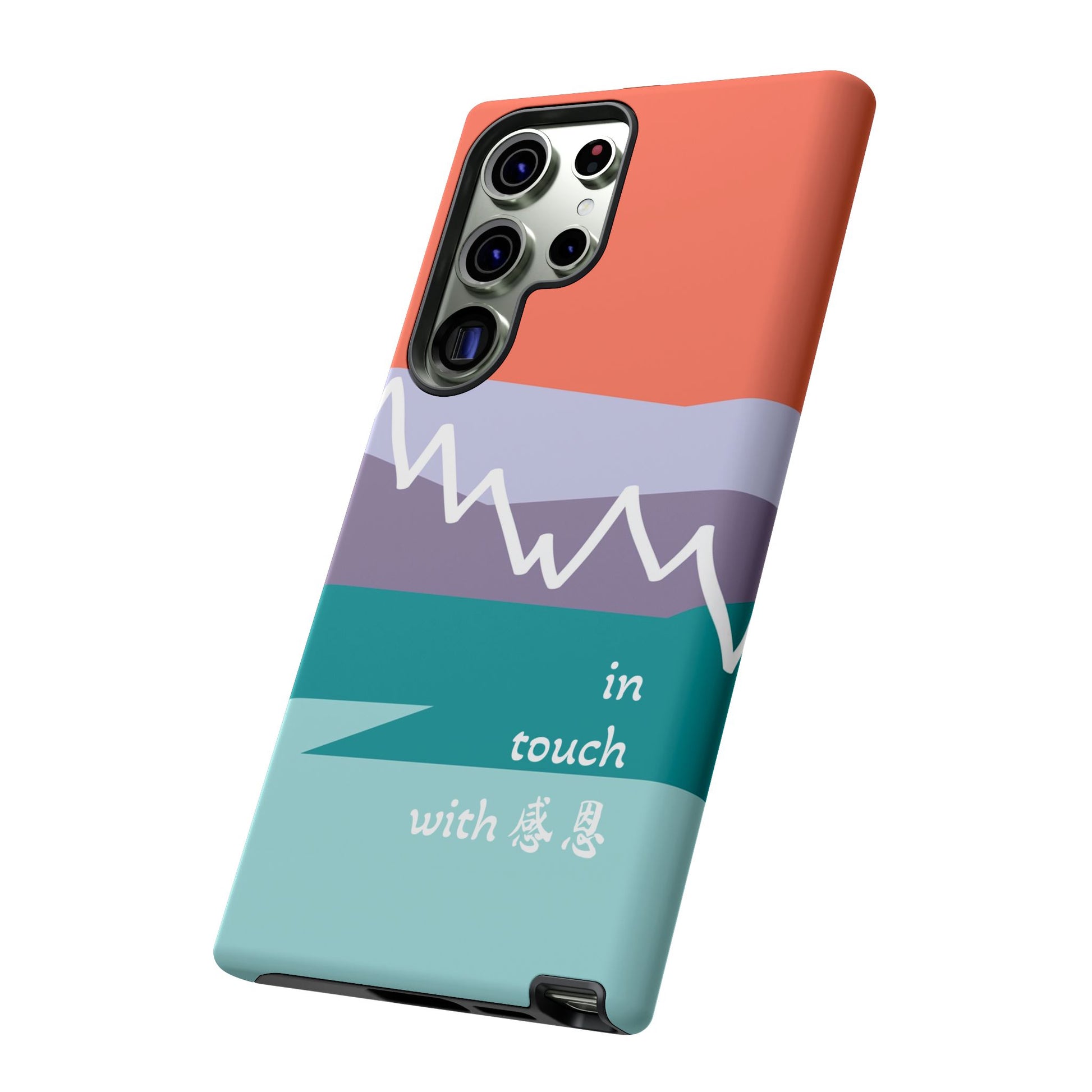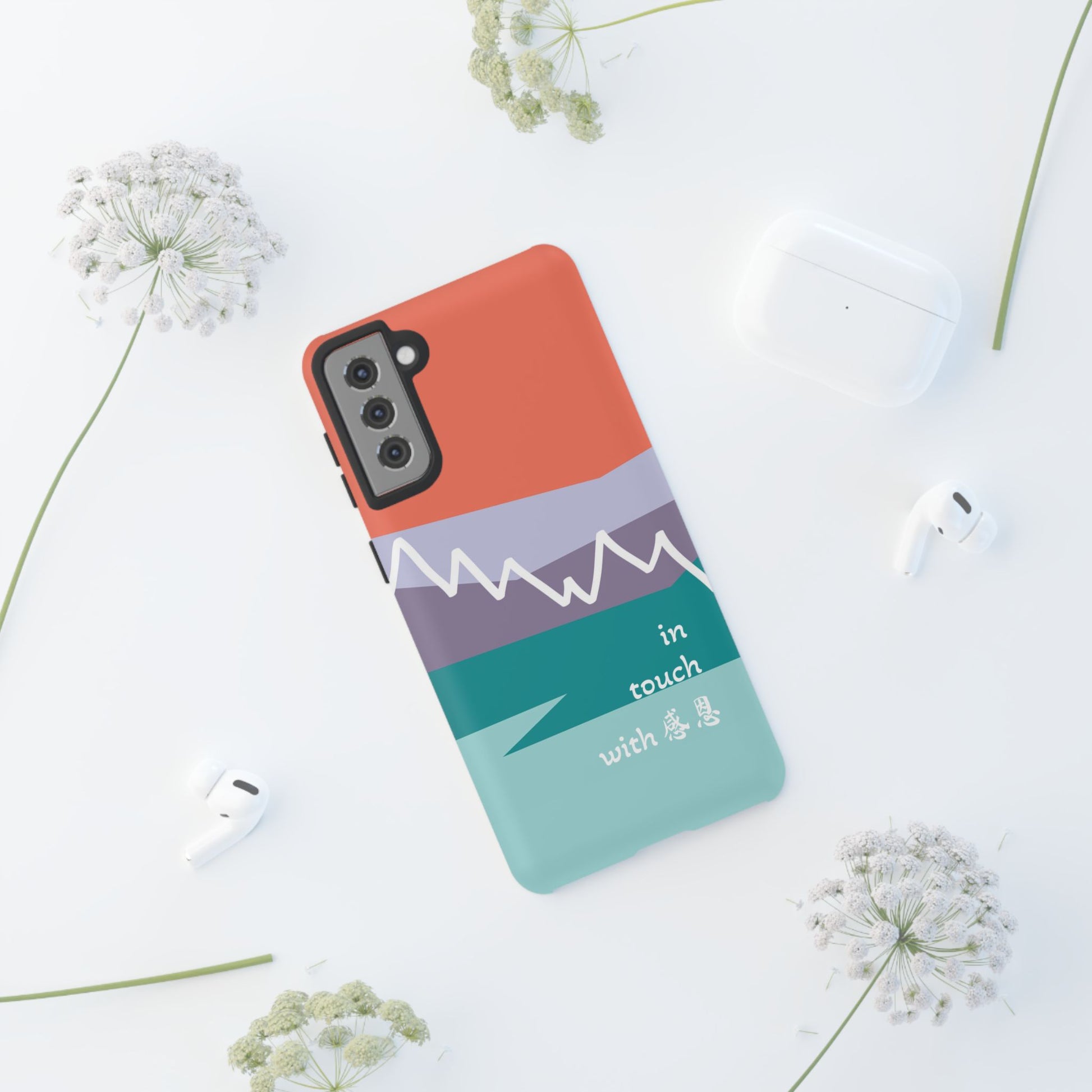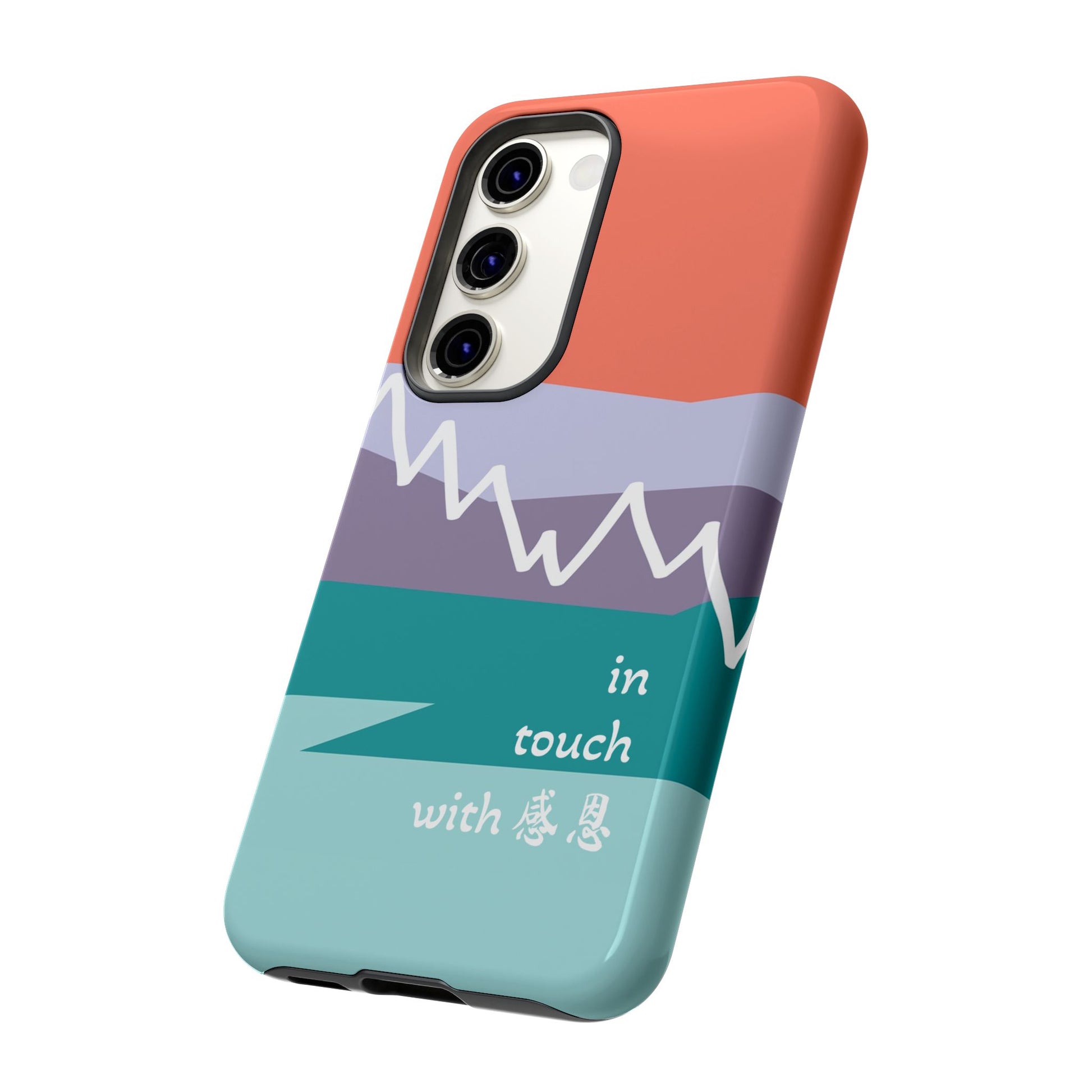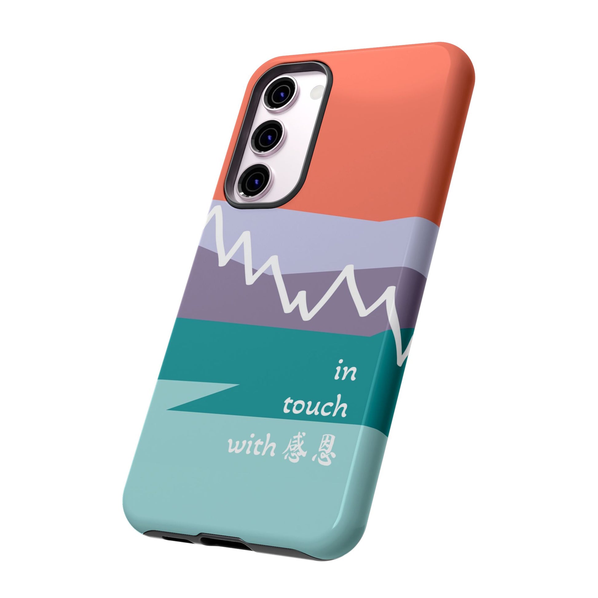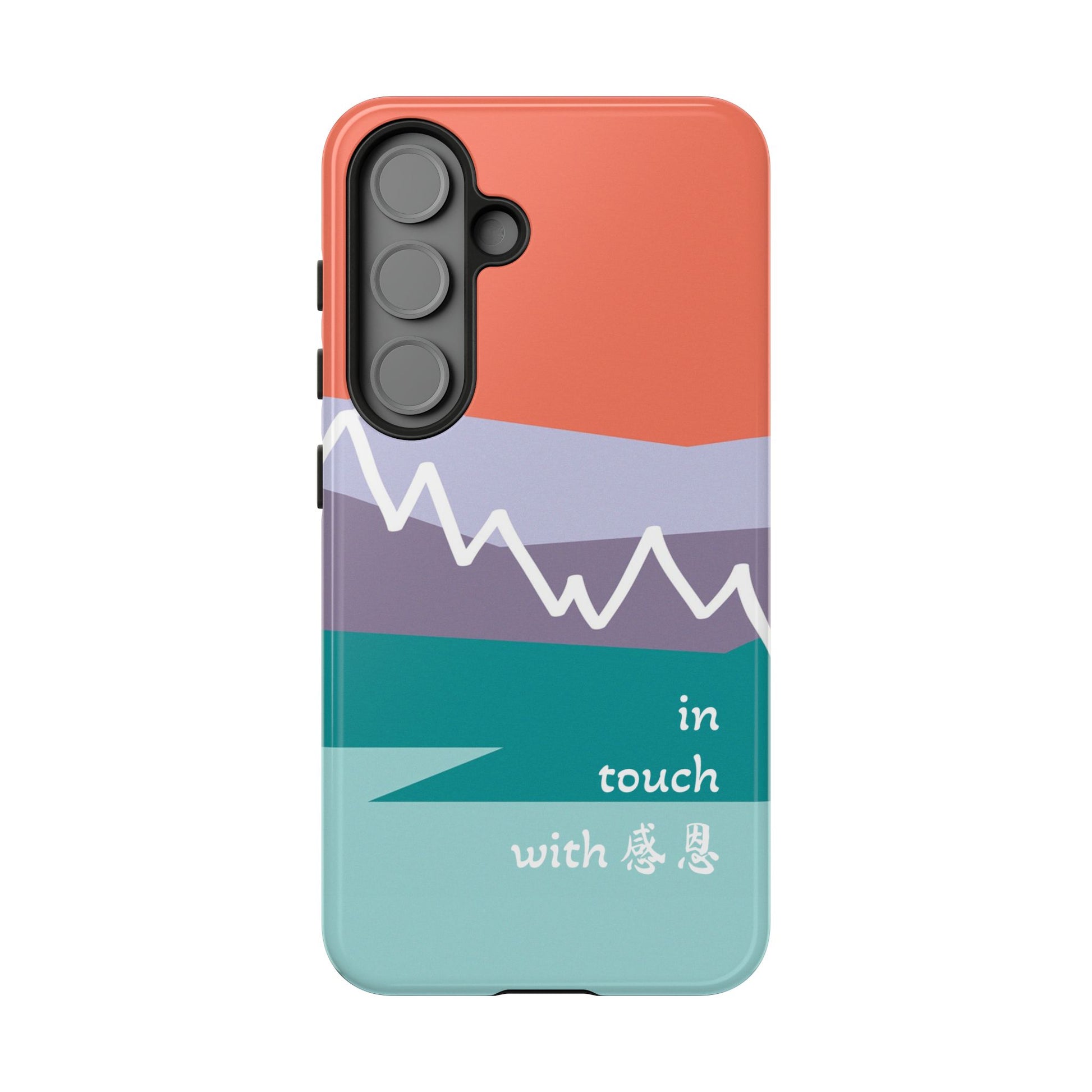 A durable and impact-resistant phone case featuring a hand-illustrated colour-blocked west coast mountain motif with a 感恩 message. Perfect for adults and young adults who appreciate unique, artistic designs and want to protect their phone in style. Ideal for gifting on birthdays, holidays, or as a thank you gesture.