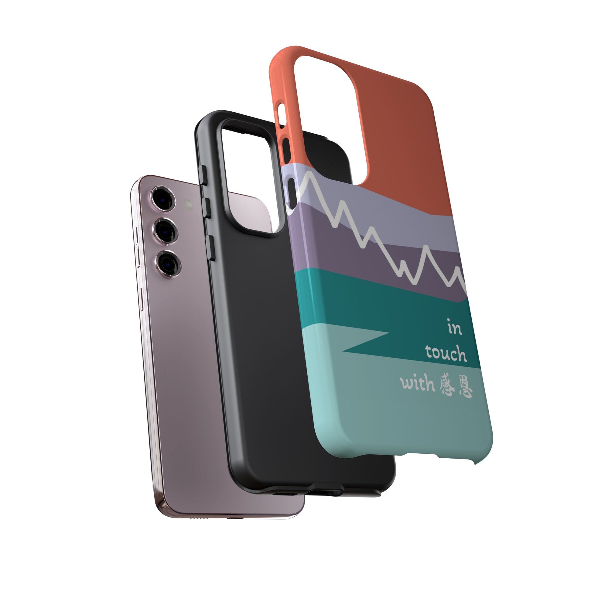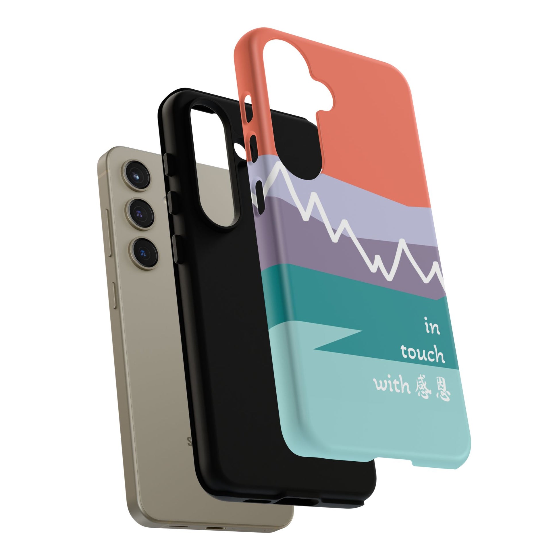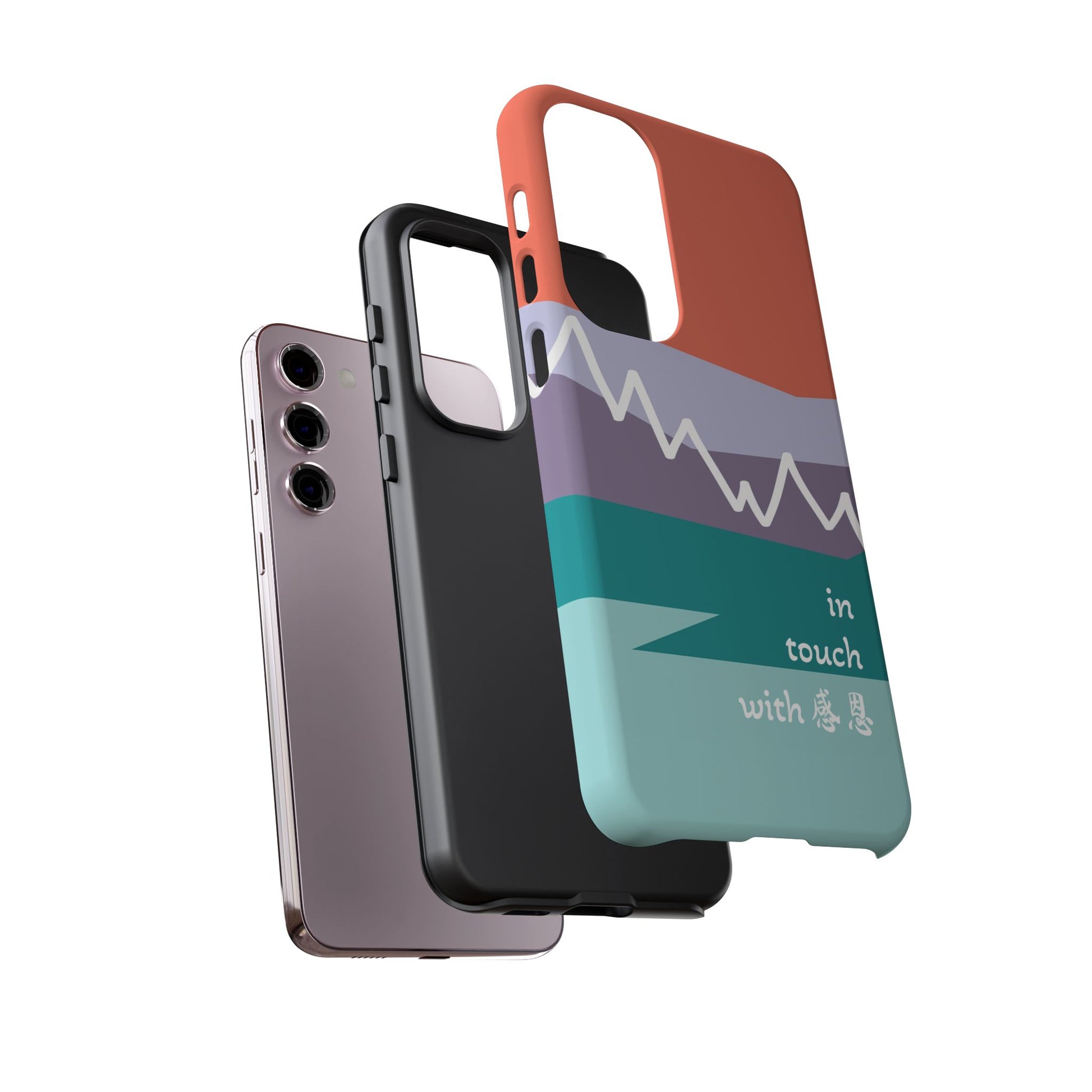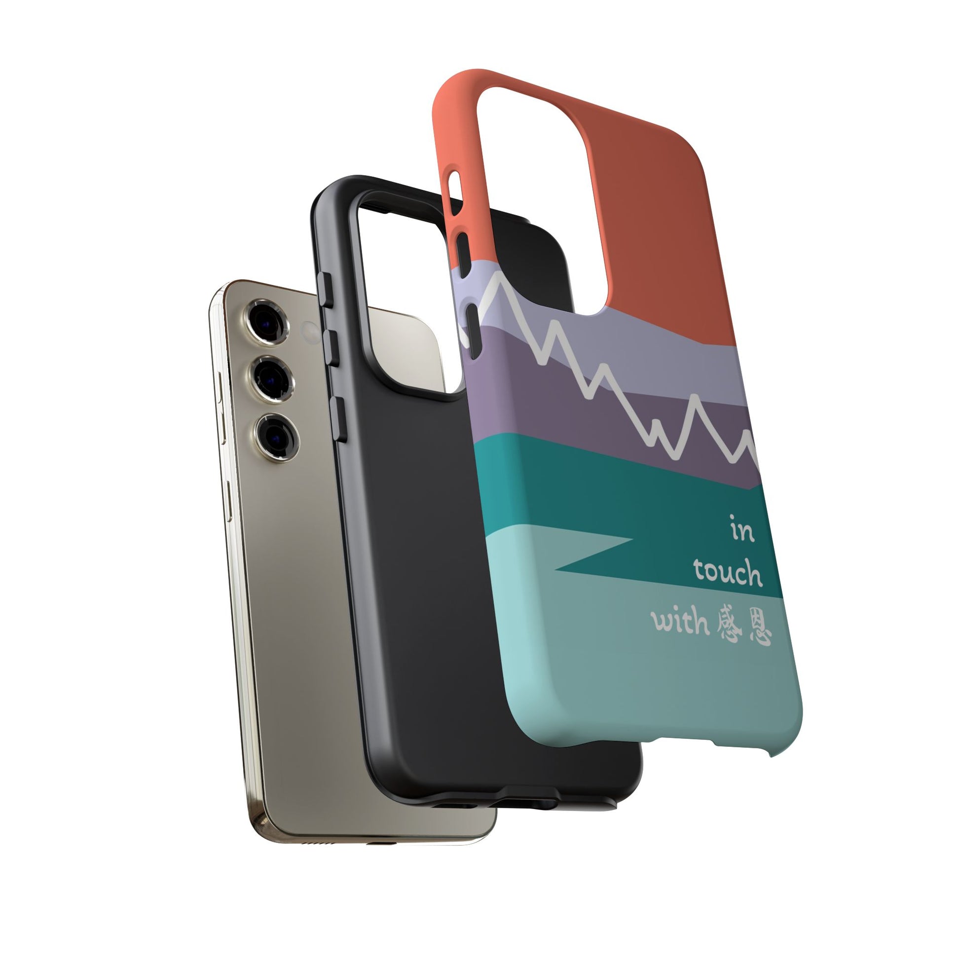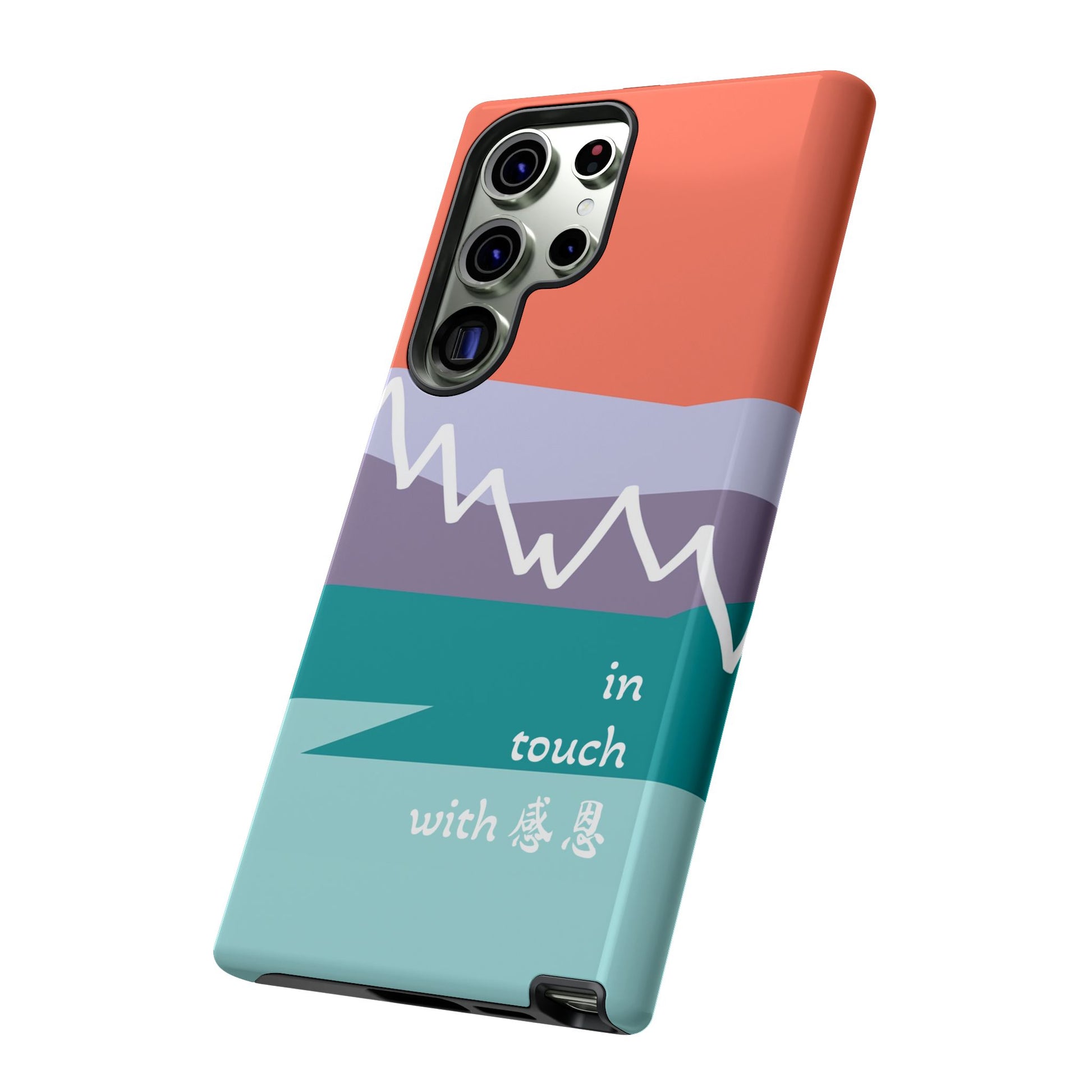 A durable and impact-resistant phone case featuring a hand-illustrated colour-blocked west coast mountain motif with a 感恩 message. Perfect for adults and young adults who appreciate unique, artistic designs and want to protect their phone in style. Ideal for gifting on birthdays, holidays, or as a thank you gesture.