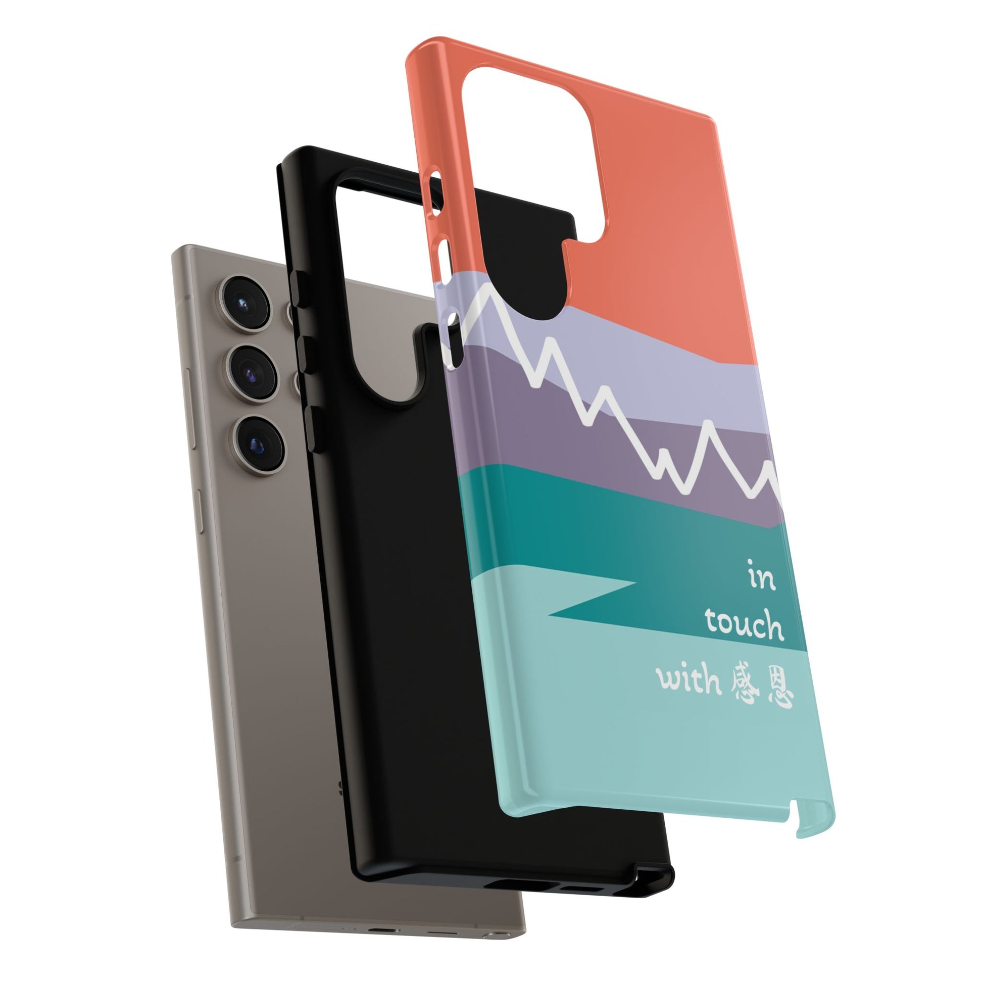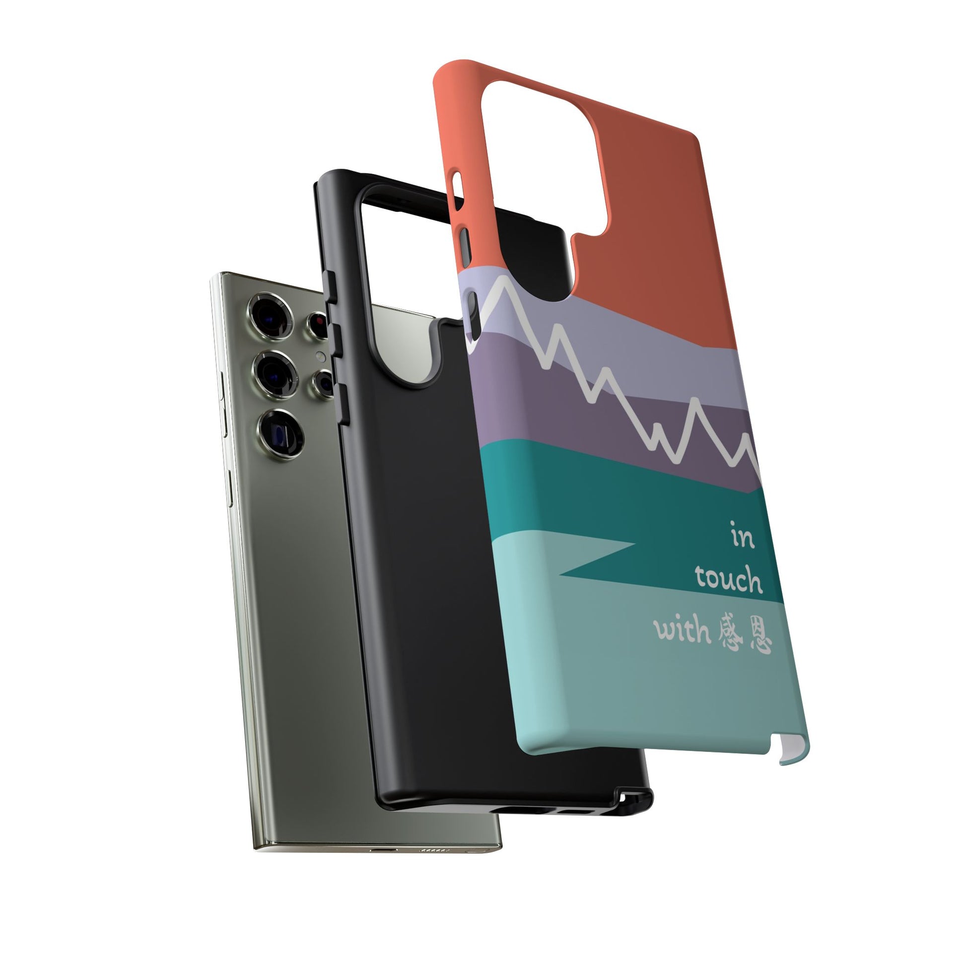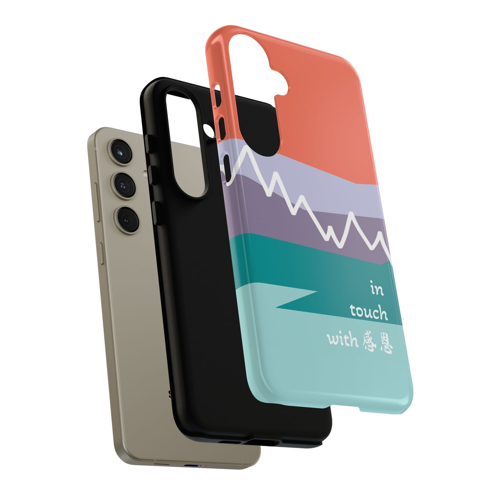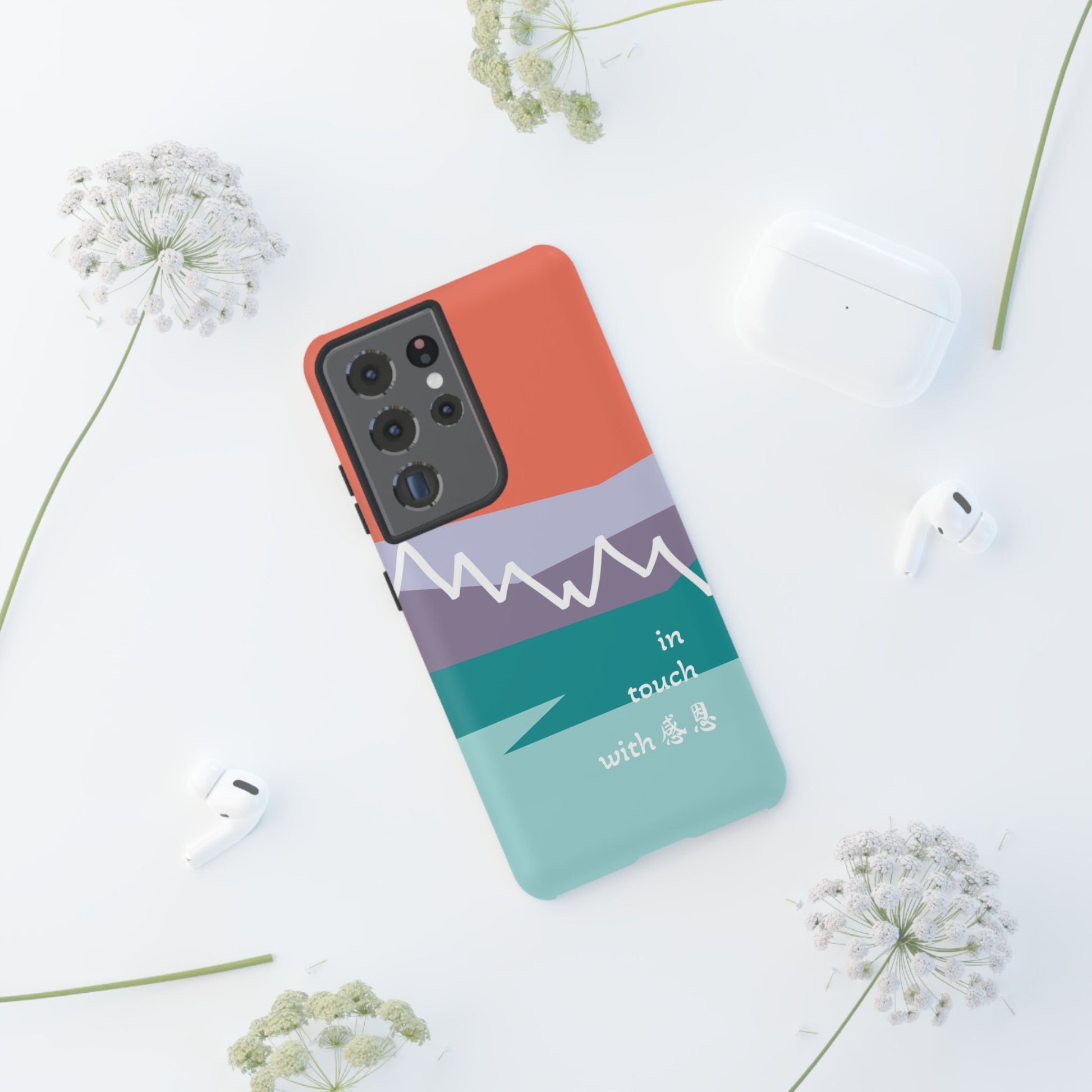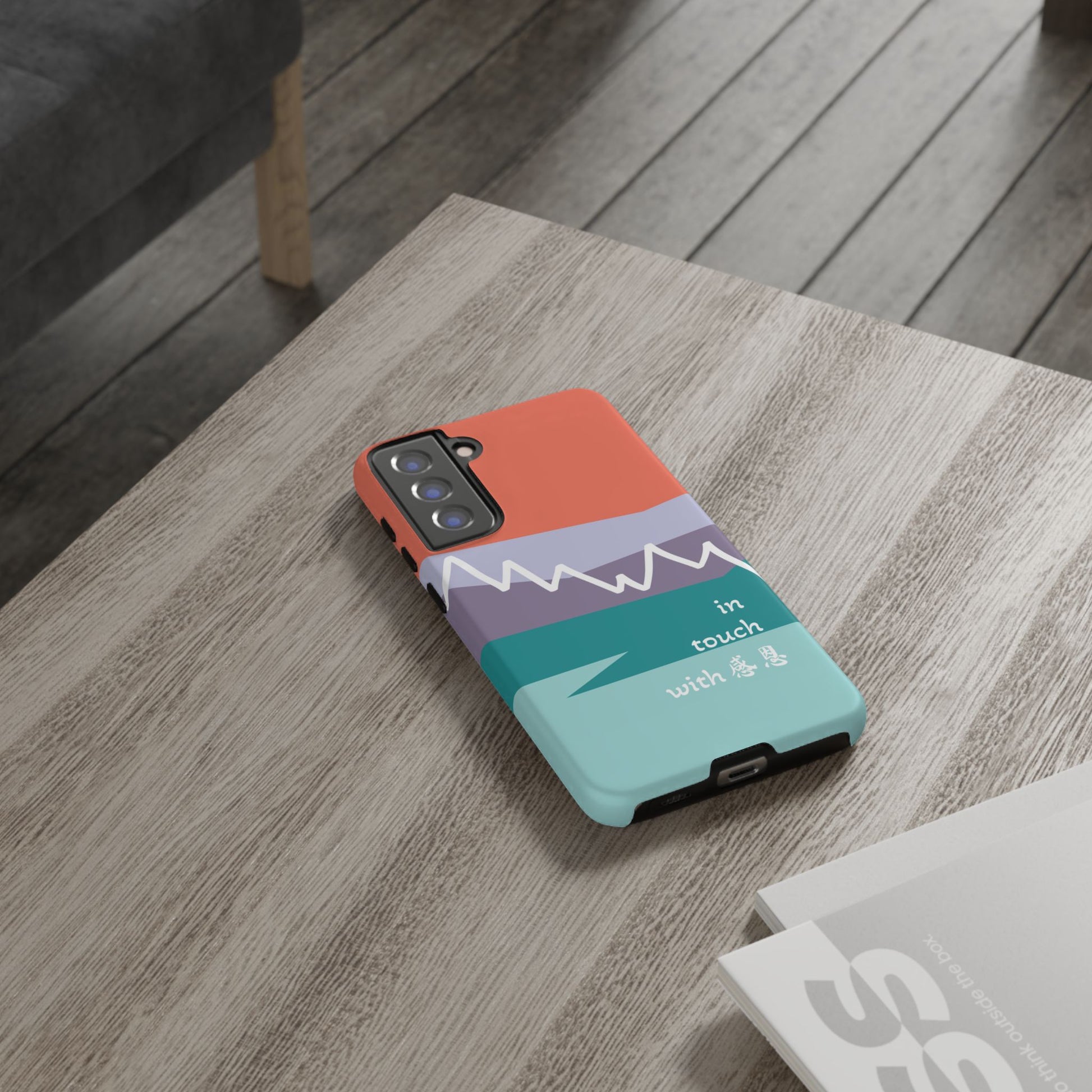 A durable and impact-resistant phone case featuring a hand-illustrated colour-blocked west coast mountain motif with a 感恩 message. Perfect for adults and young adults who appreciate unique, artistic designs and want to protect their phone in style. Ideal for gifting on birthdays, holidays, or as a thank you gesture.