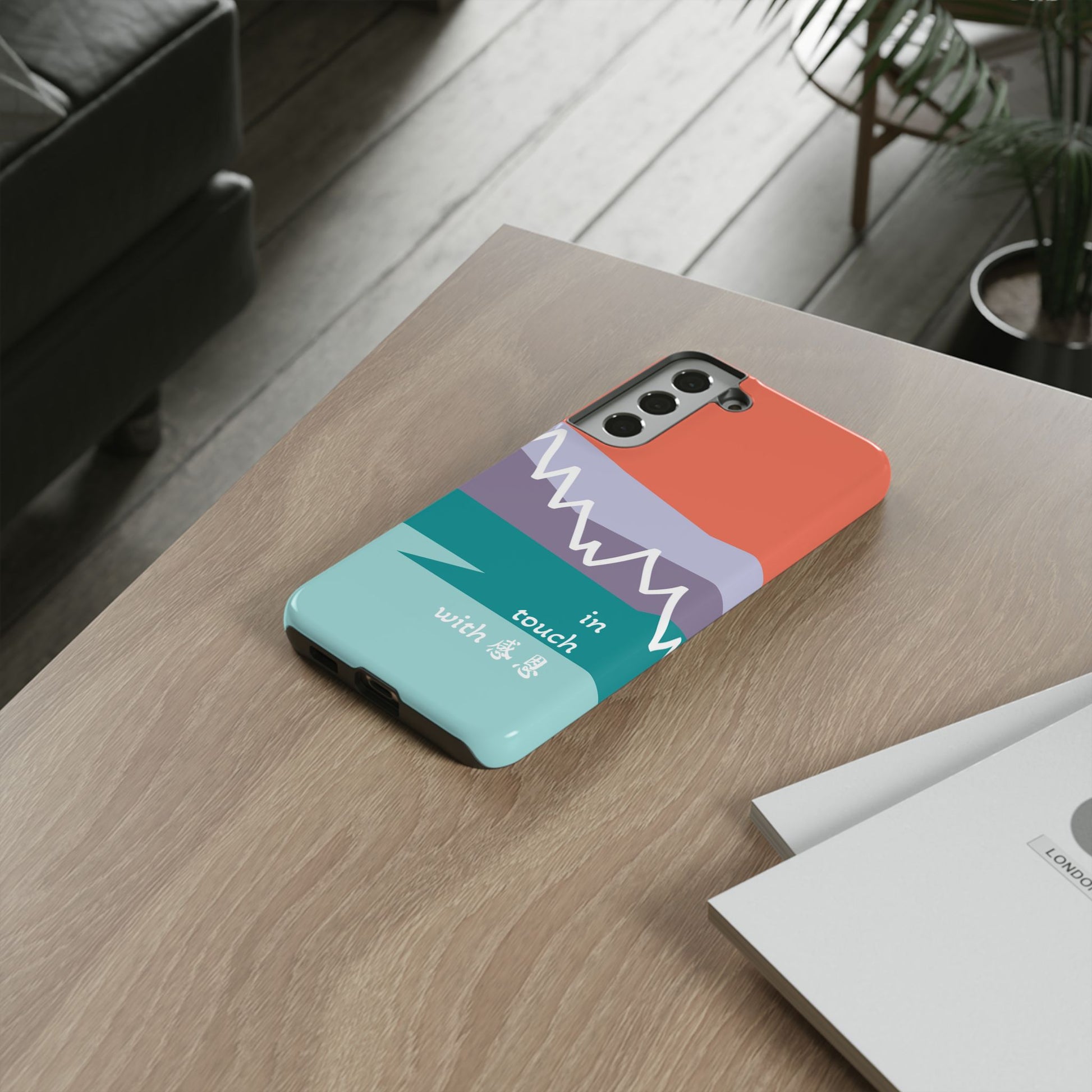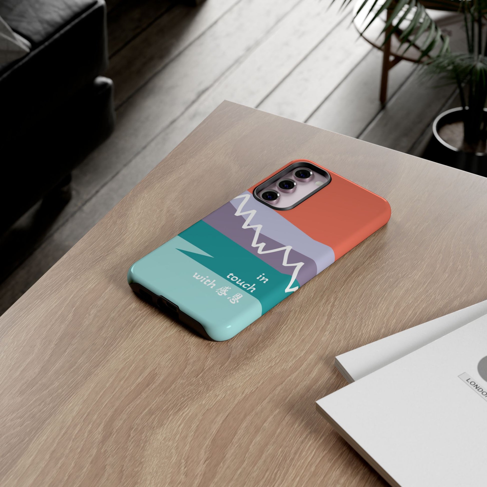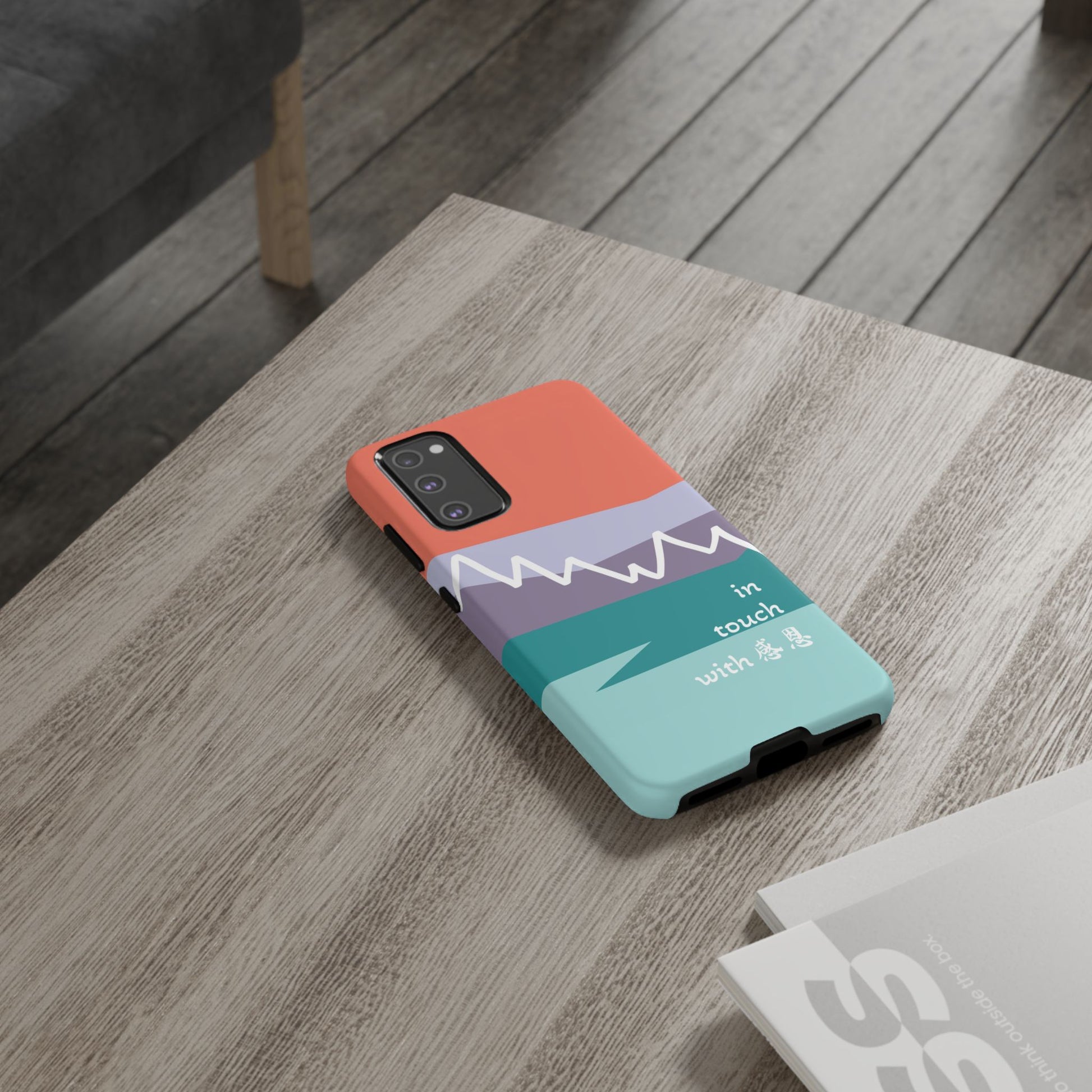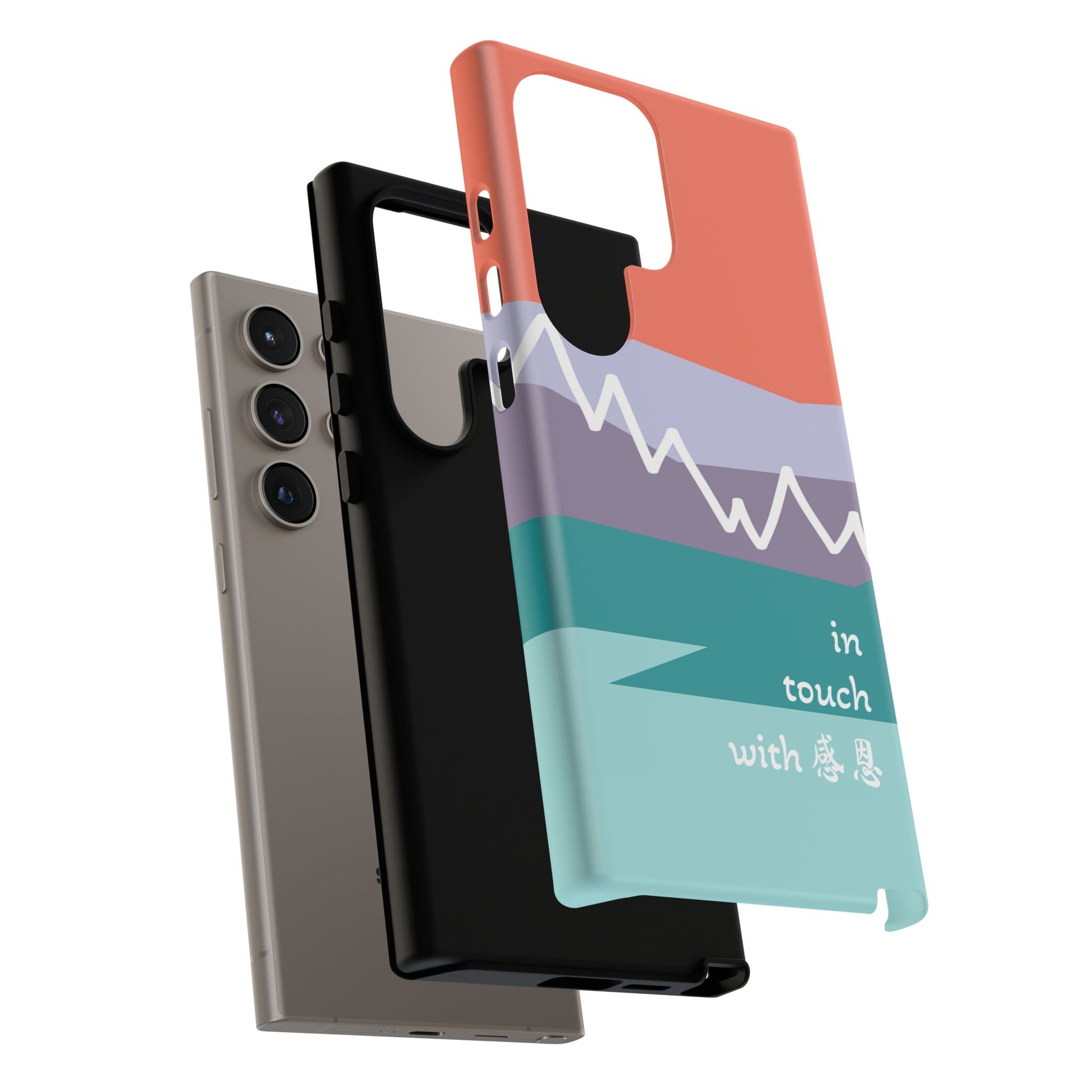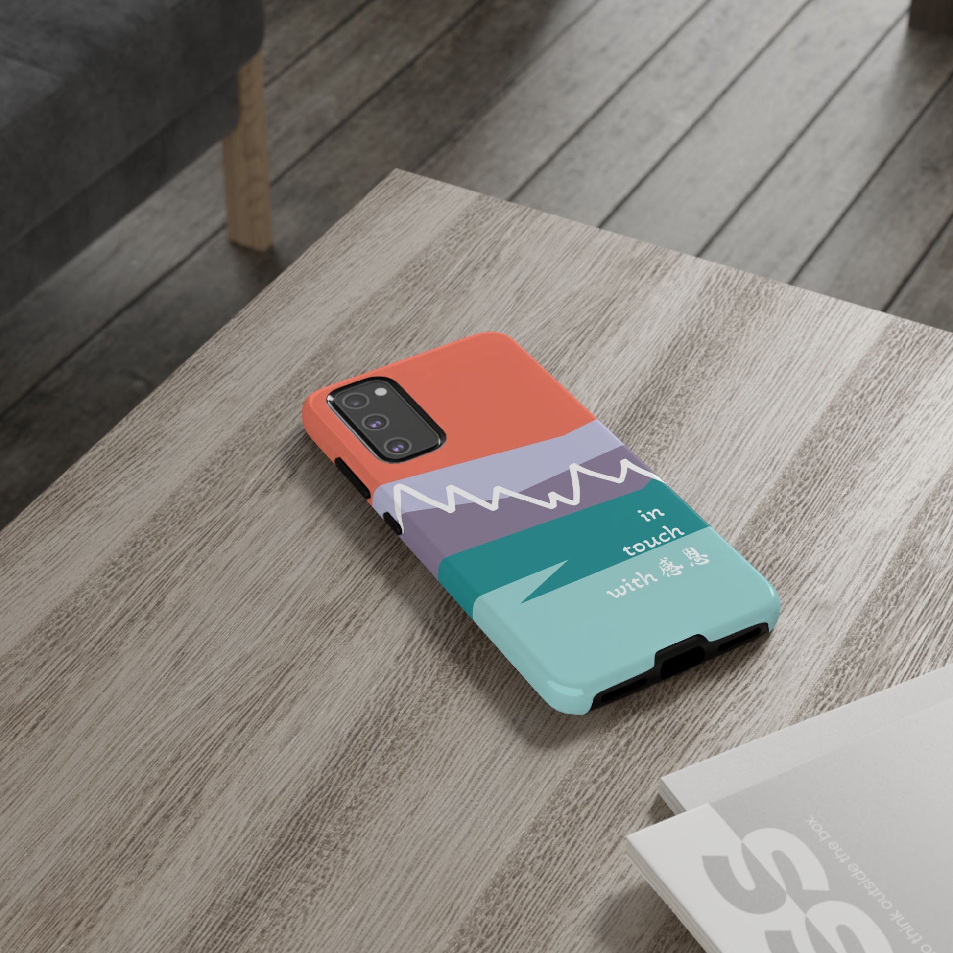 A durable and impact-resistant phone case featuring a hand-illustrated colour-blocked west coast mountain motif with a 感恩 message. Perfect for adults and young adults who appreciate unique, artistic designs and want to protect their phone in style. Ideal for gifting on birthdays, holidays, or as a thank you gesture.