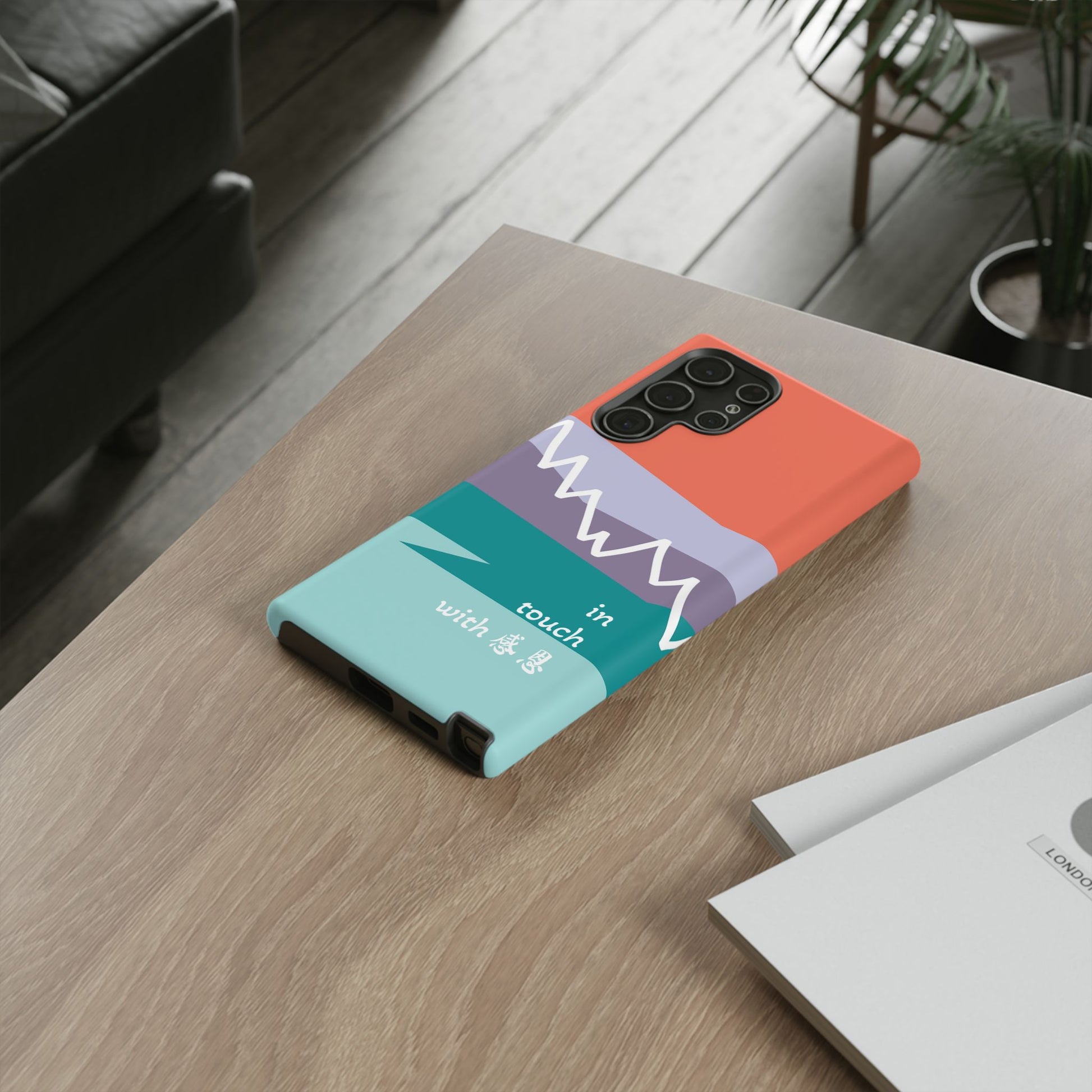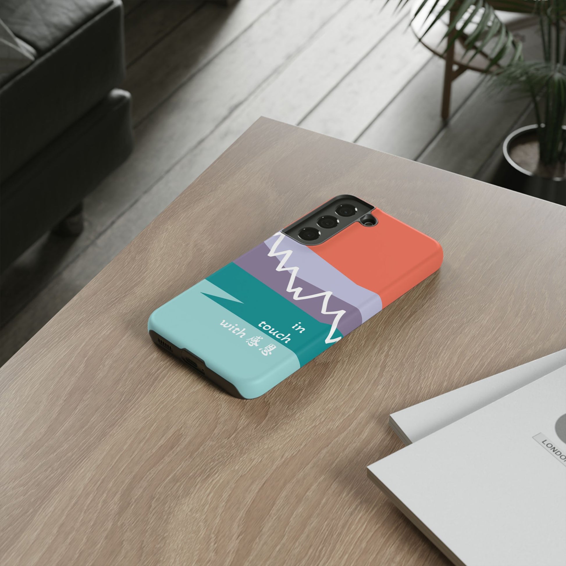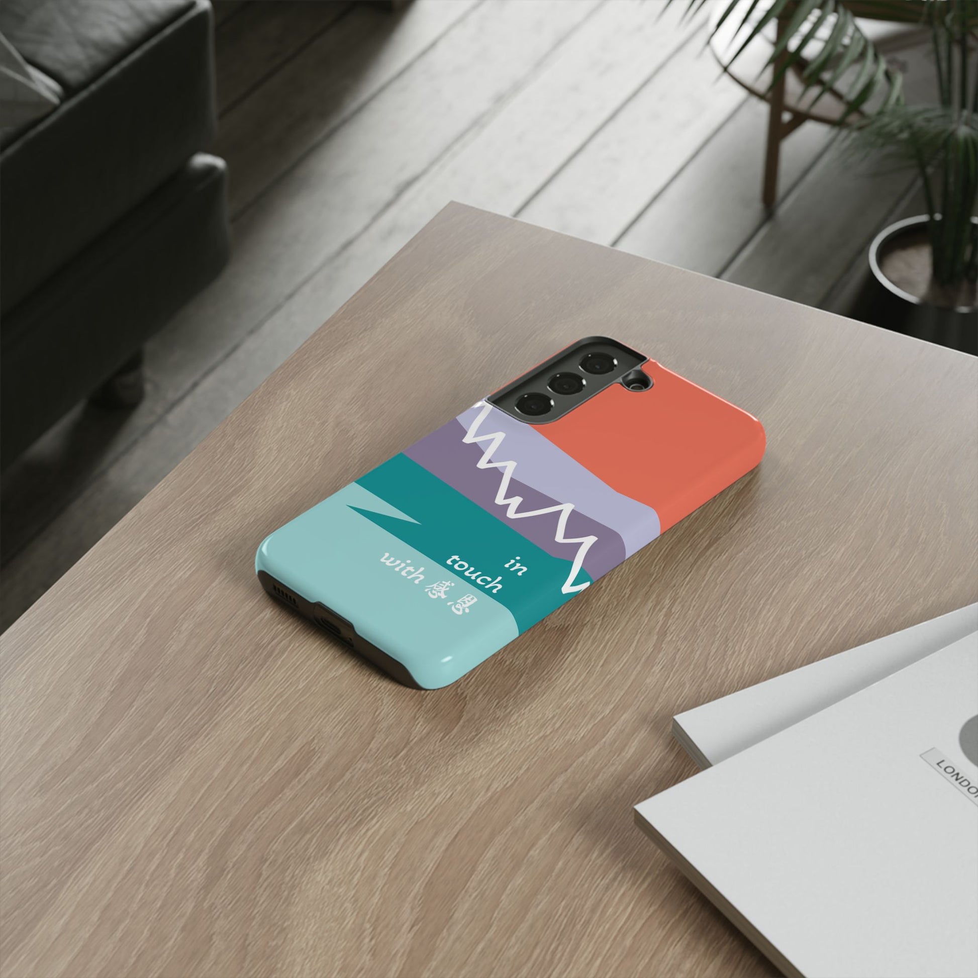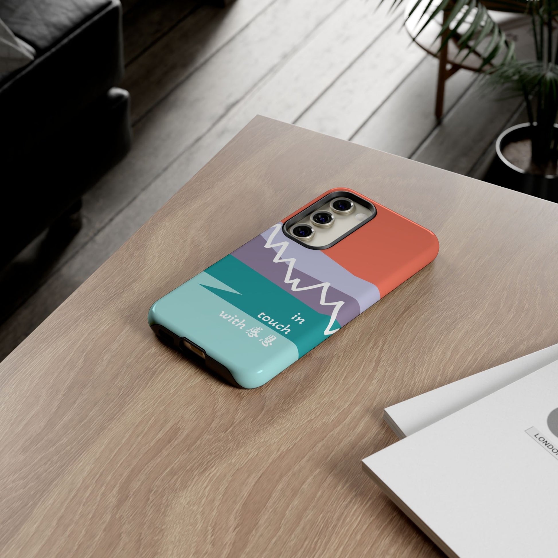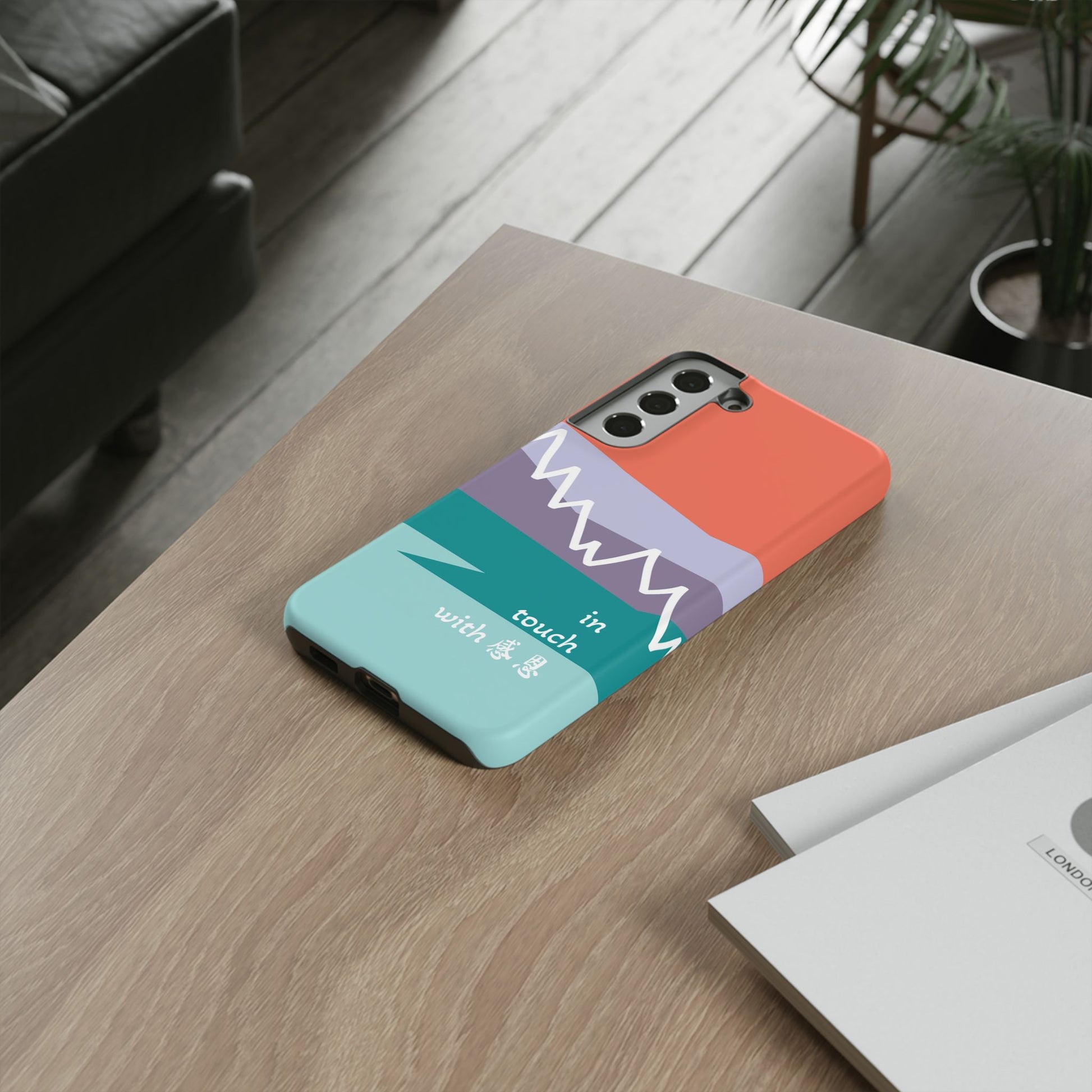 A durable and impact-resistant phone case featuring a hand-illustrated colour-blocked west coast mountain motif with a 感恩 message. Perfect for adults and young adults who appreciate unique, artistic designs and want to protect their phone in style. Ideal for gifting on birthdays, holidays, or as a thank you gesture.