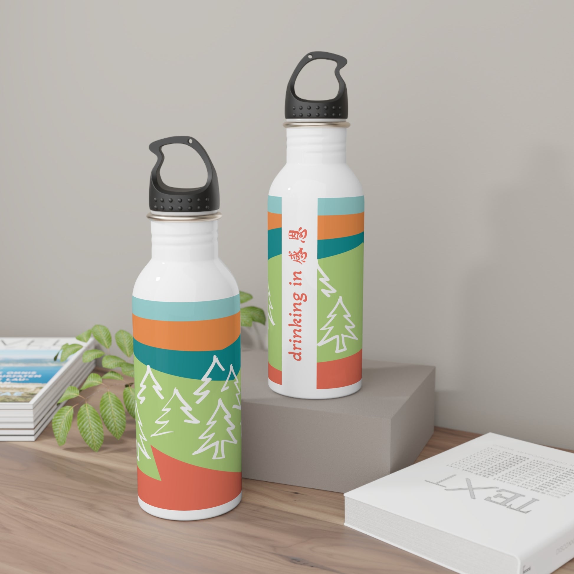 Stainless Steel Water Bottle - Forest 感恩 Motif with Coral Pink-Orange Message