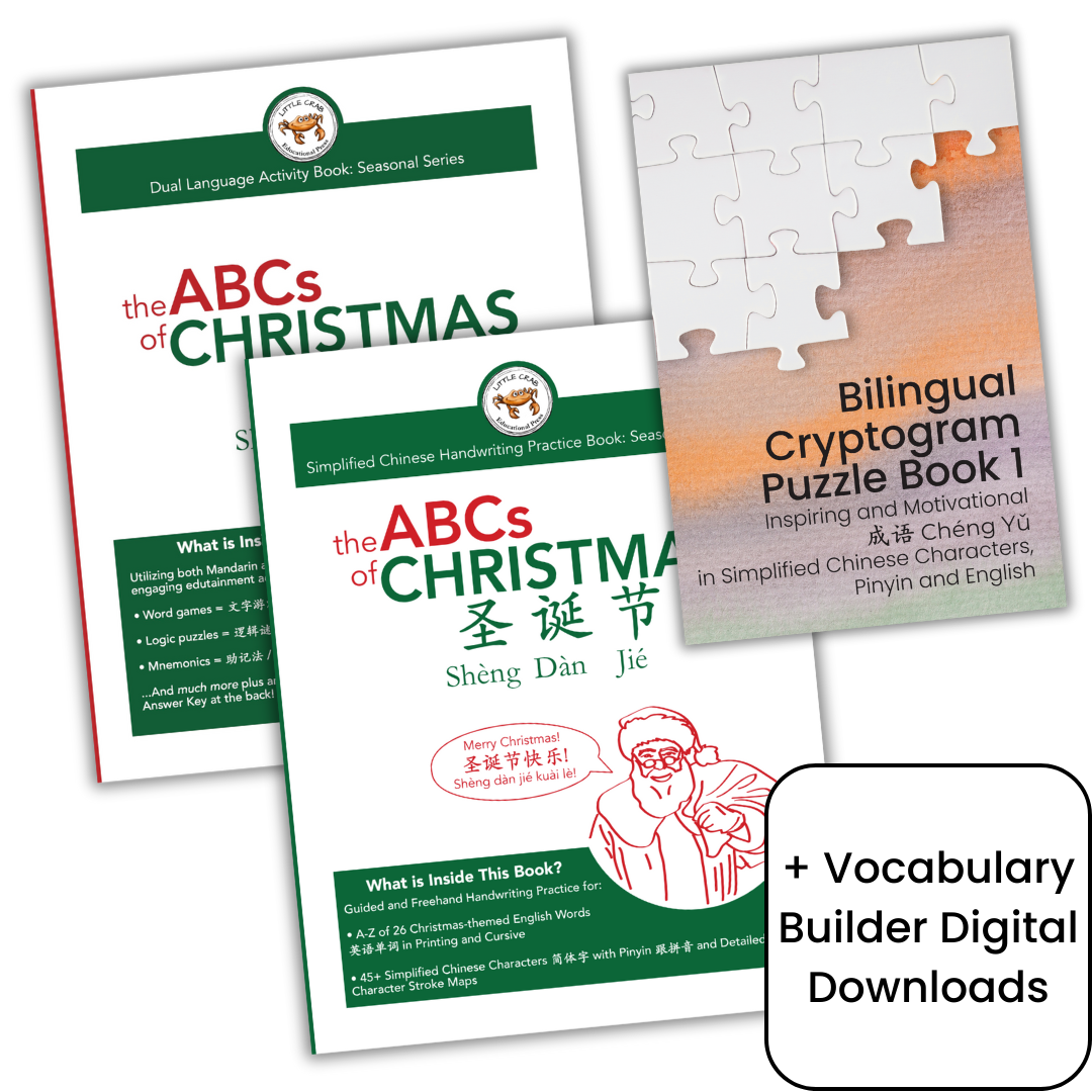 Help your child (or yourself!) practice characters for 26 Christmas words while promoting mindfulness through festive fun. Meanwhile the activity book offers engaging puzzles and tasks that spark creativity and logical thinking. Plus, unlock wisdom with our Cryptogram Chengyu Book, blending secret codes with Chinese idioms. Plus! Instant Digital Downloads of our vocabulary builder system Tortoise Tiles for the Christmas vocabulary and the Chengyu are included FOR FREE in this bundle! This delightful bundle enhances language skills while encouraging calm and thoughtful engagement—perfect for a joyful and mindful holiday season!
